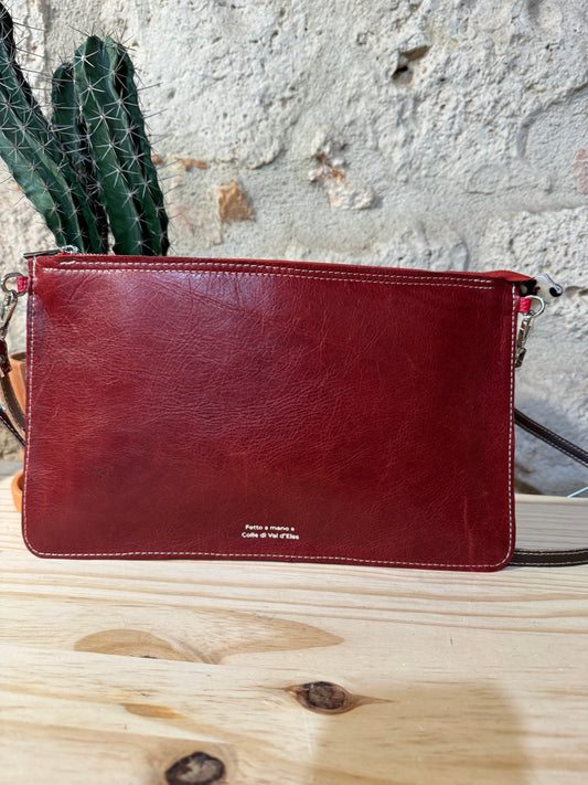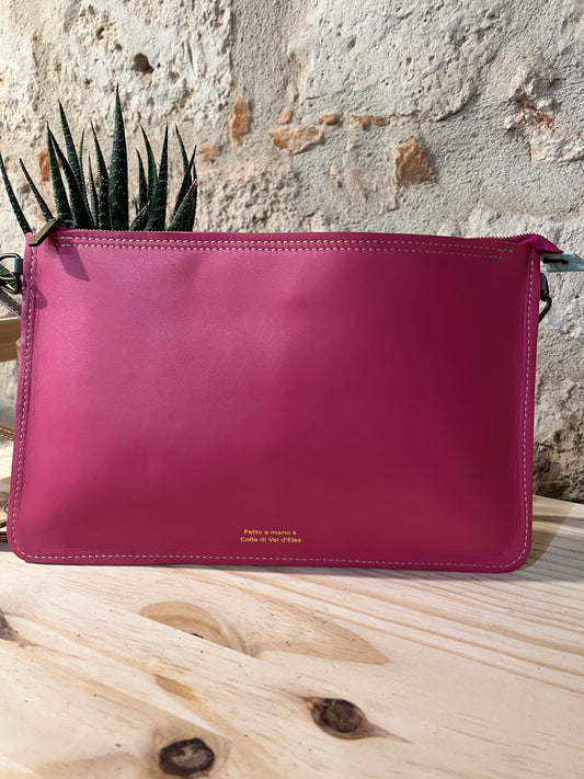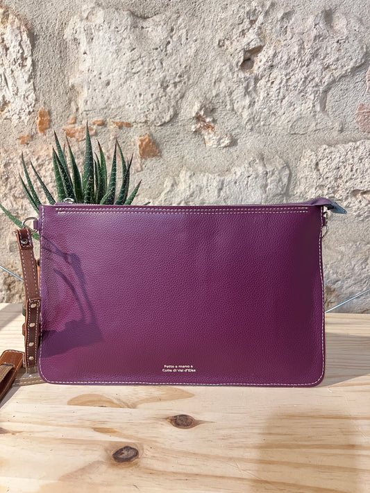 Completamente in pelle, due lati diversi per dare maggiore movimento di colori ad una borsa che vuol esse piccola per uscire ma abbastanza grande per tutto il necessario.