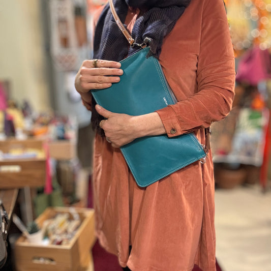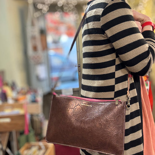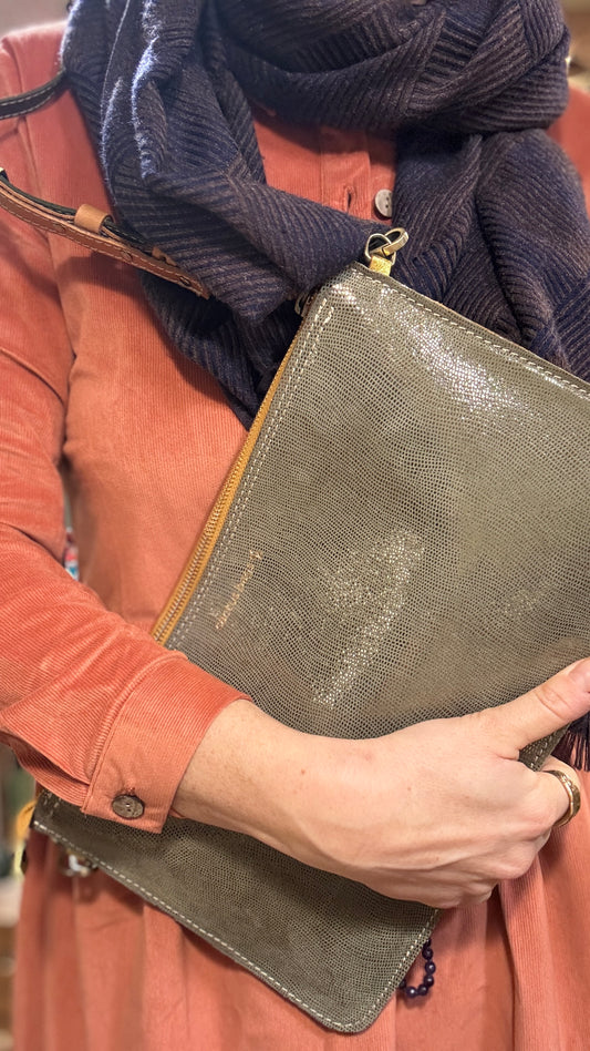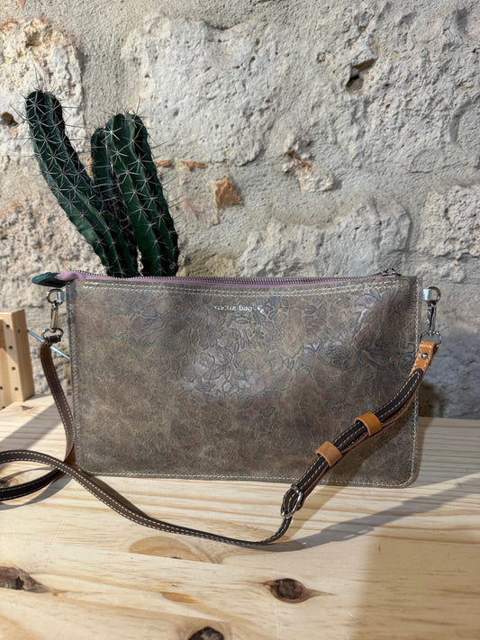 Foderata in cotone con tasca interna con mascherina in pelle e chiusa da zip, completata da tracolla in pelle regolabile completata con poggia spalla removibile.