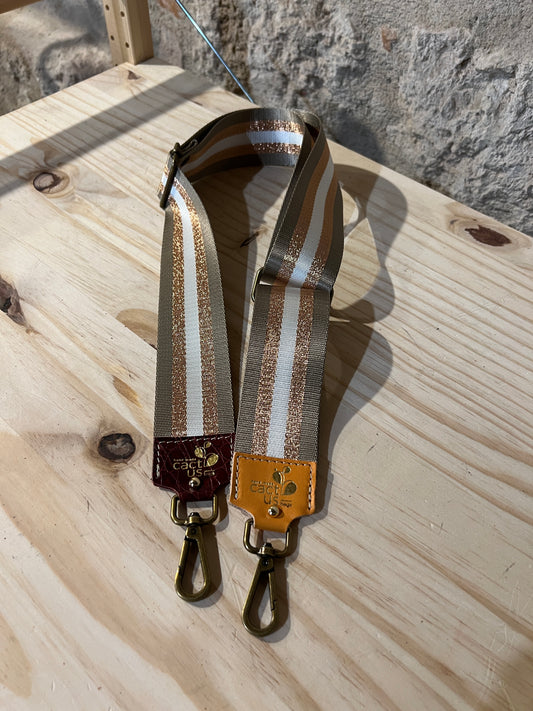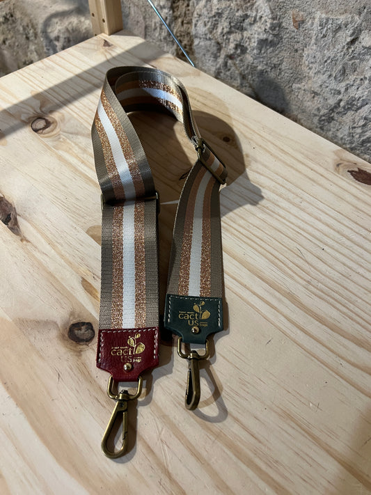 Con la sua larghezza rende ogni peso comodo da portare, lunghezza estensibile e moschettone resistente, in due colorazioni metalliche, ottone anticato e argento.