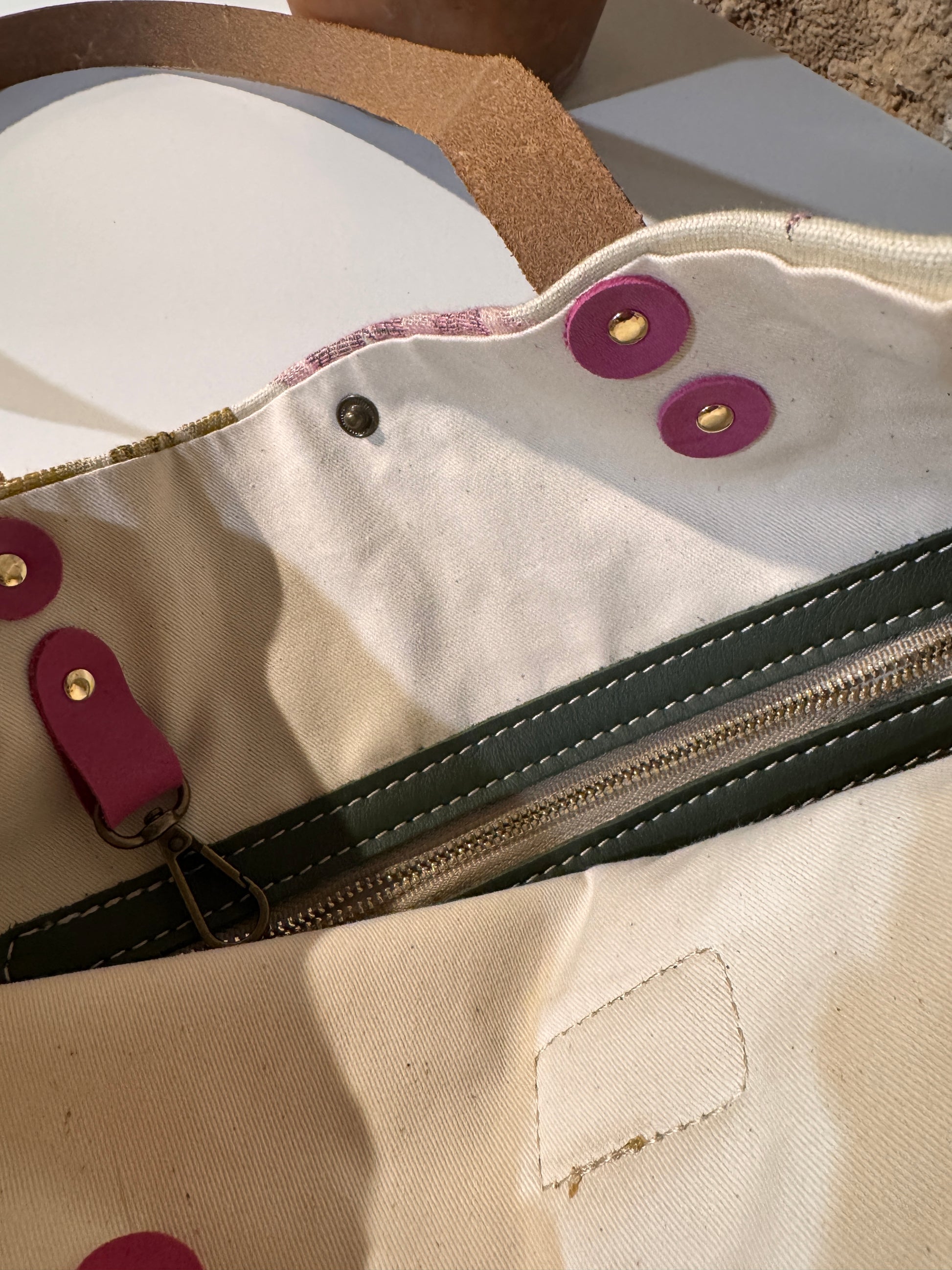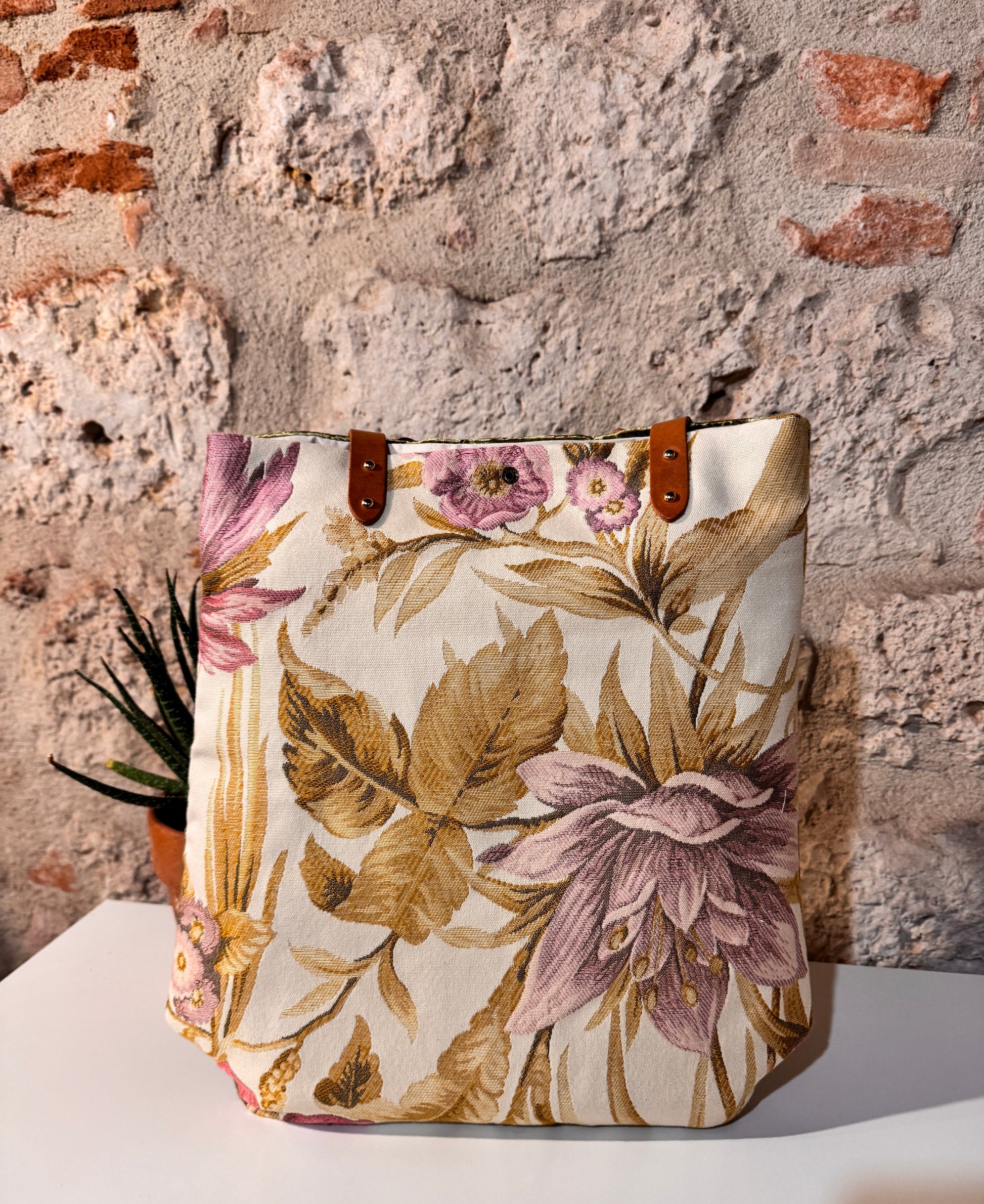 Realizzata in tessuto di tappezzeria con manici e laccetto tira zip in pelle.