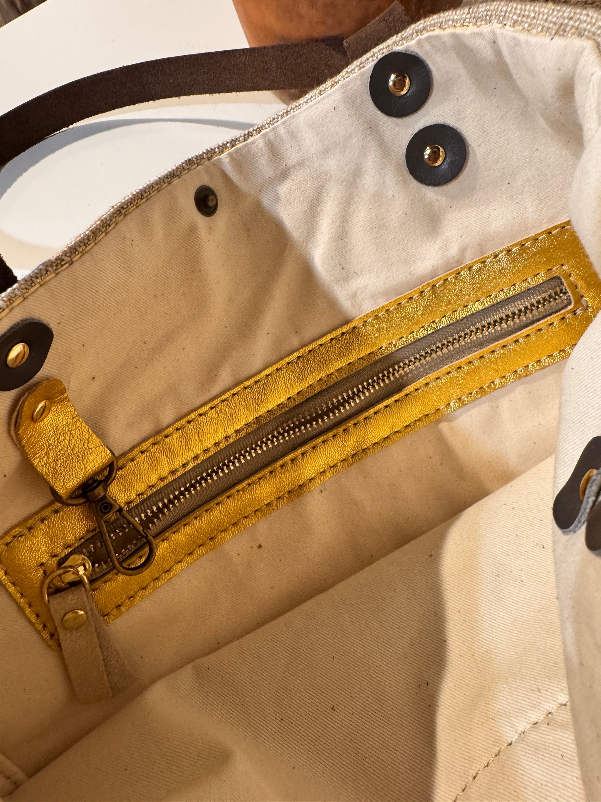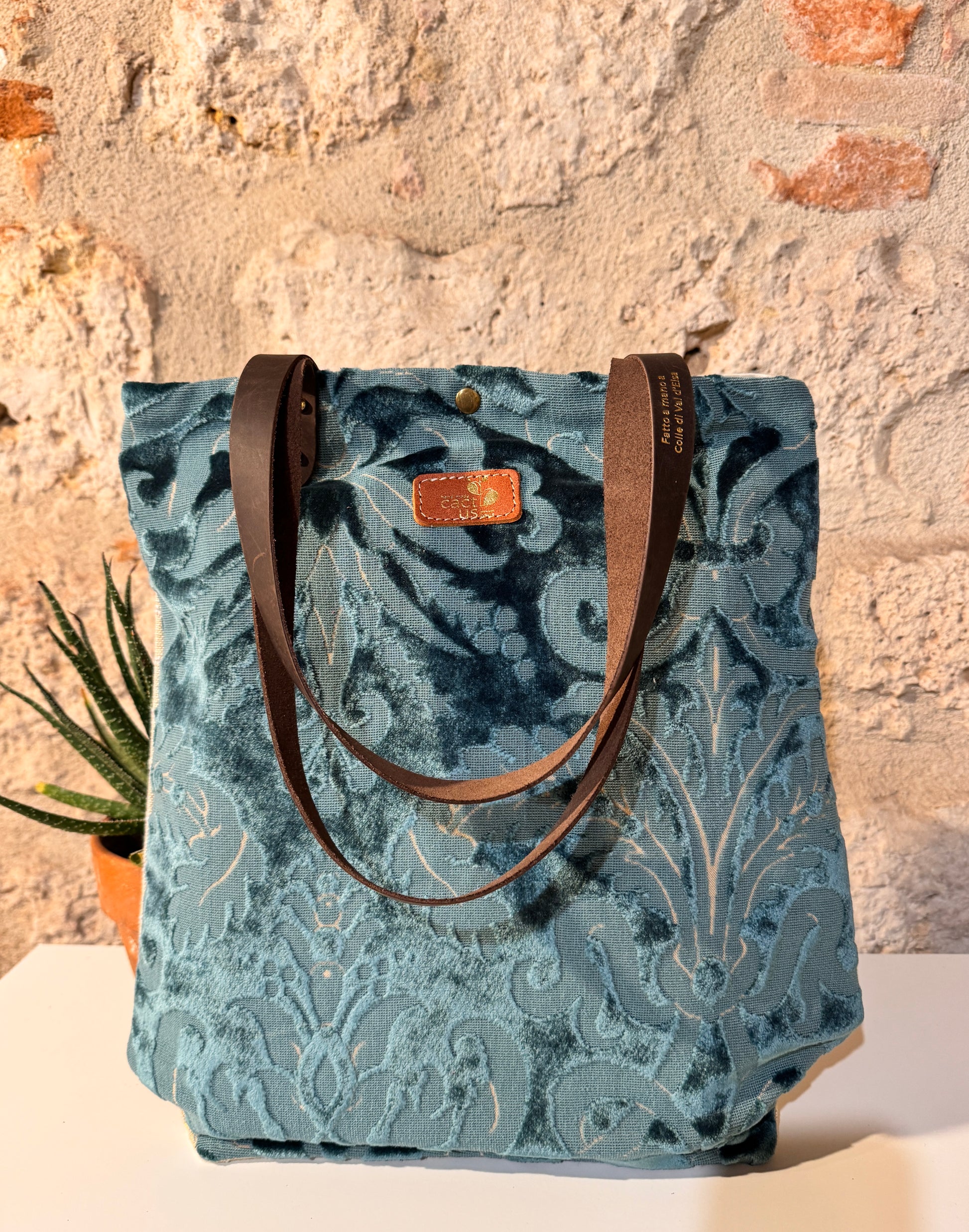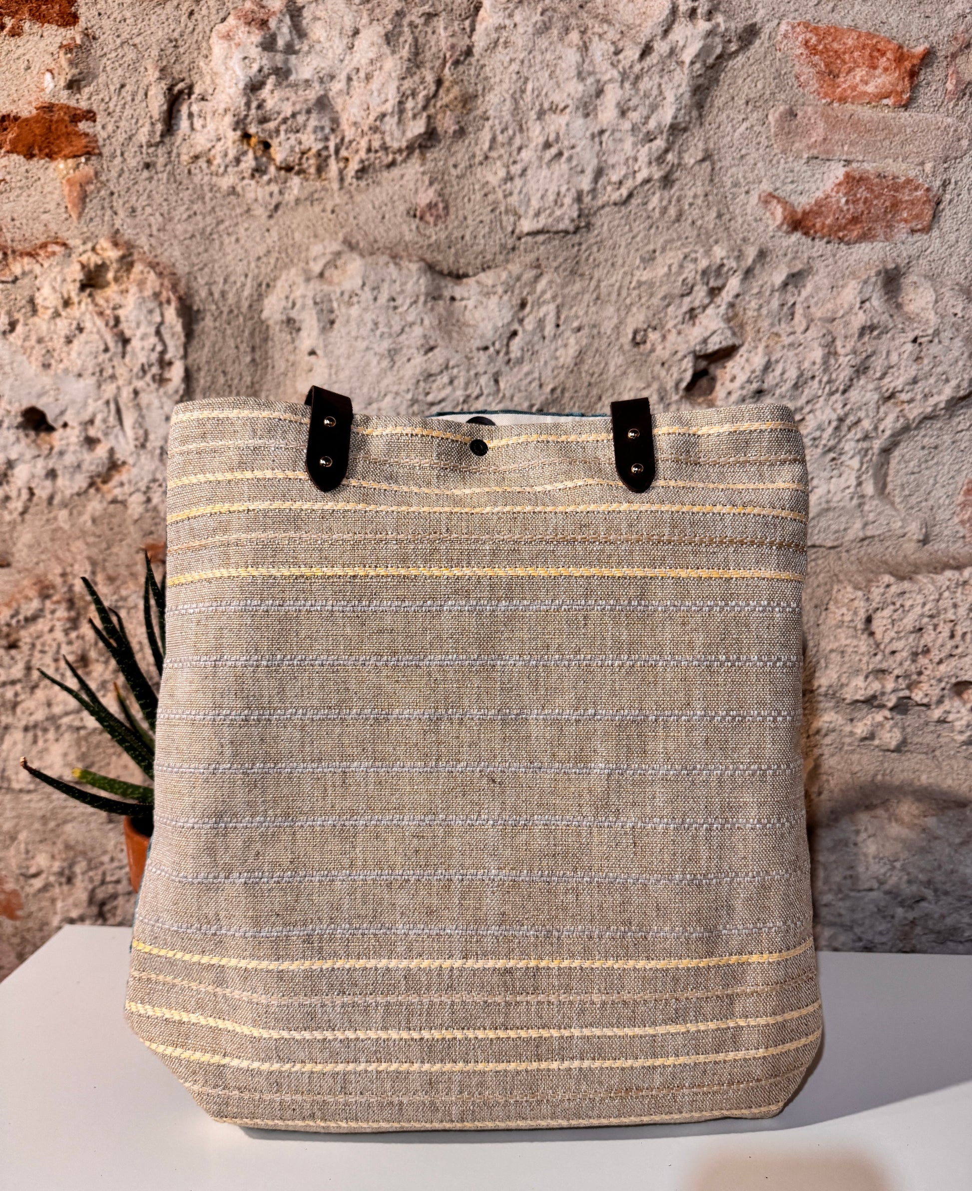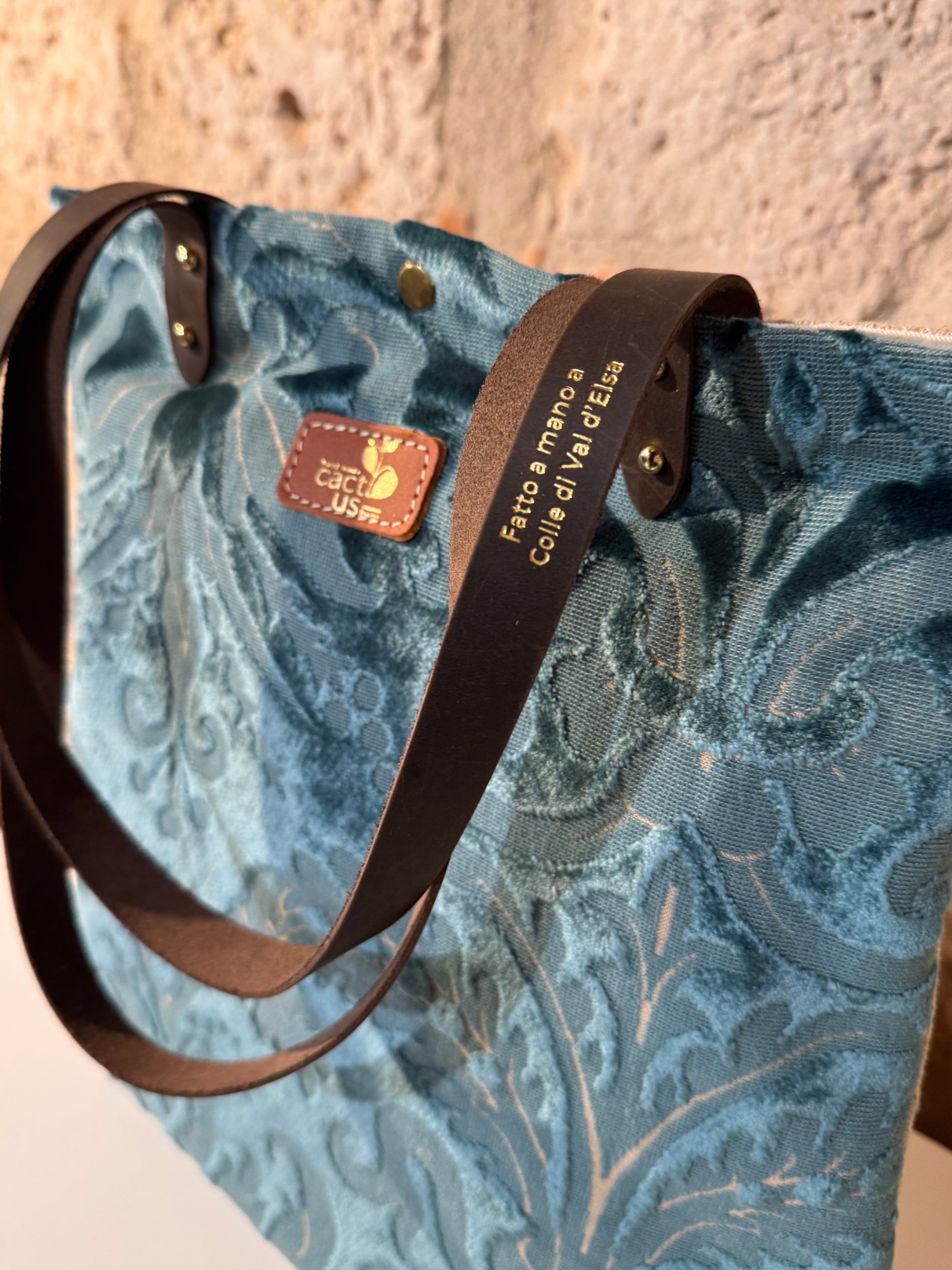 Realizzata in tessuto di tappezzeria con manici e laccetto tira zip in pelle.