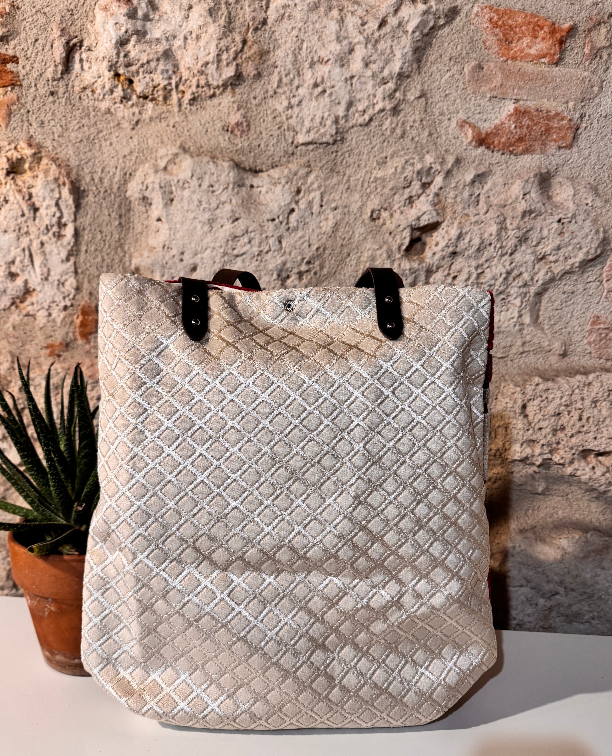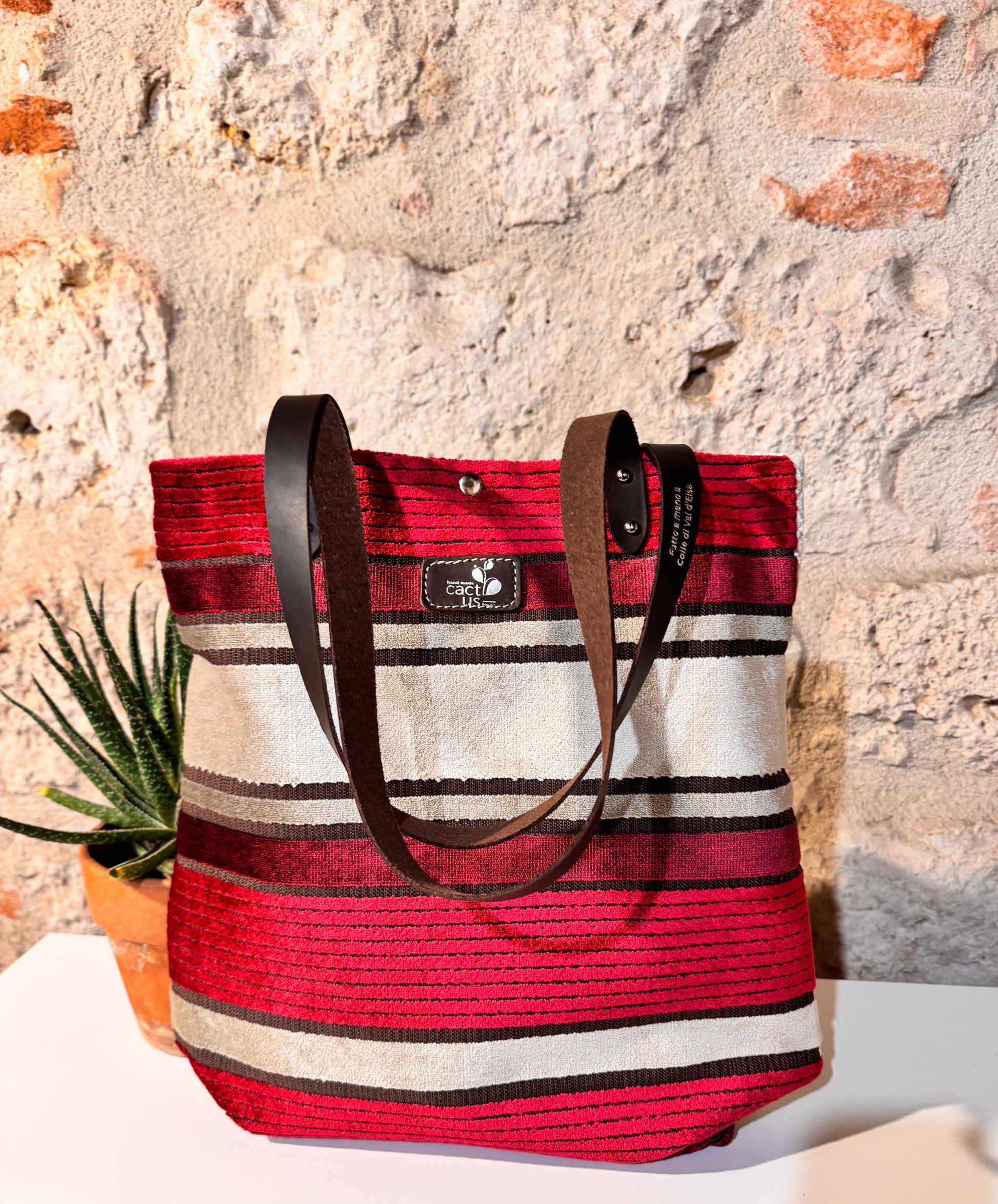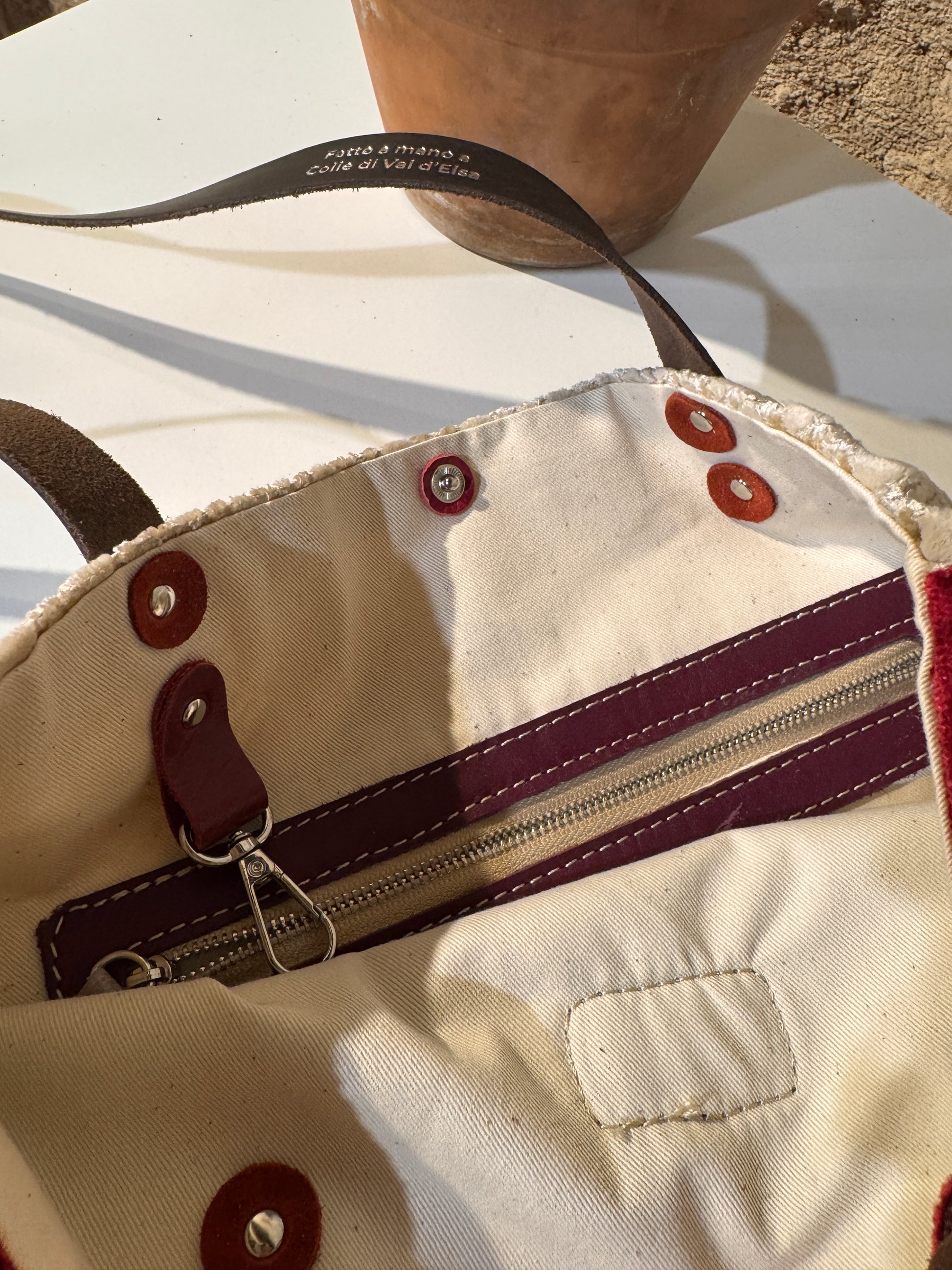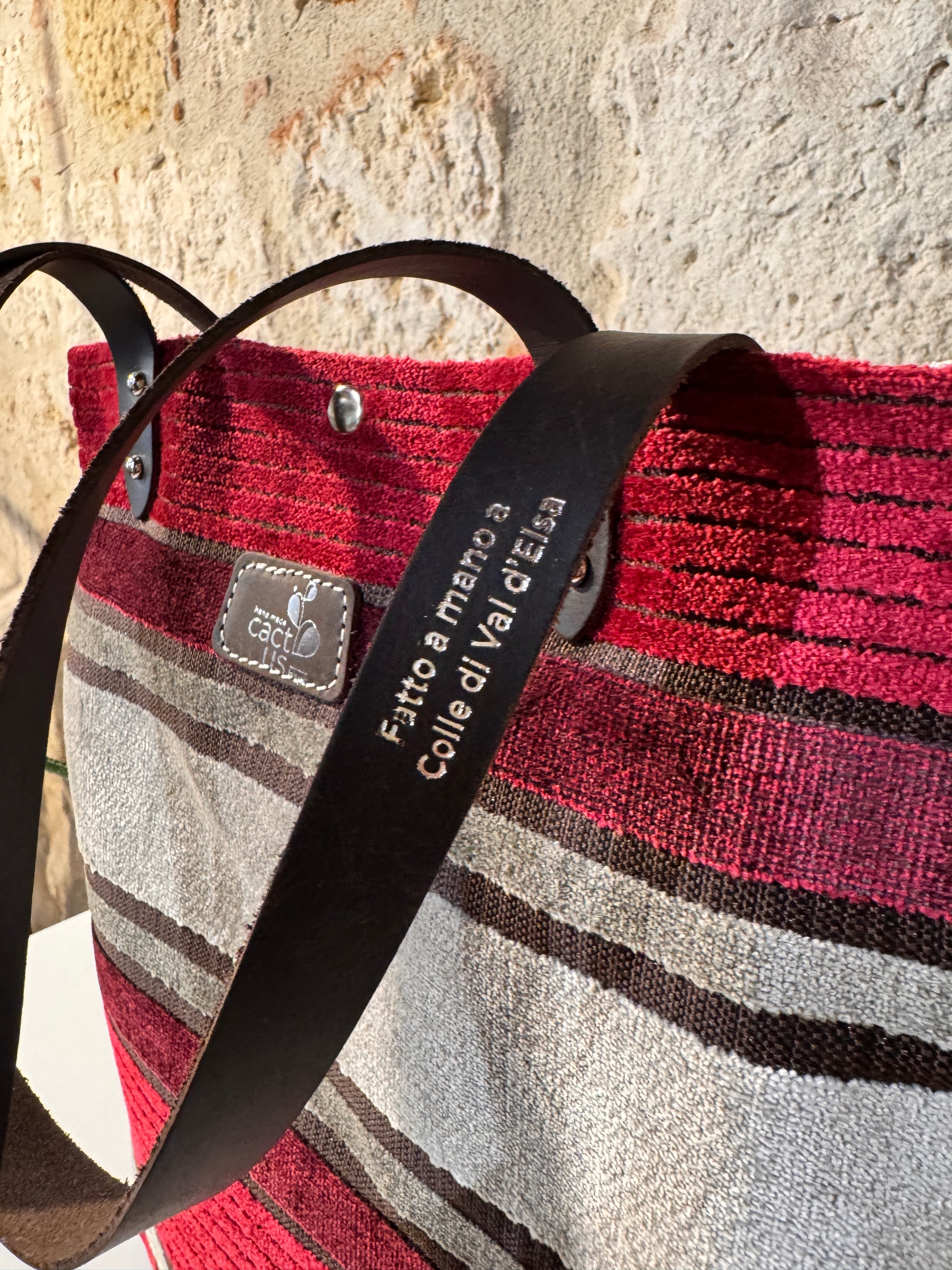 Realizzata in tessuto di tappezzeria con manici e laccetto tira zip in pelle.