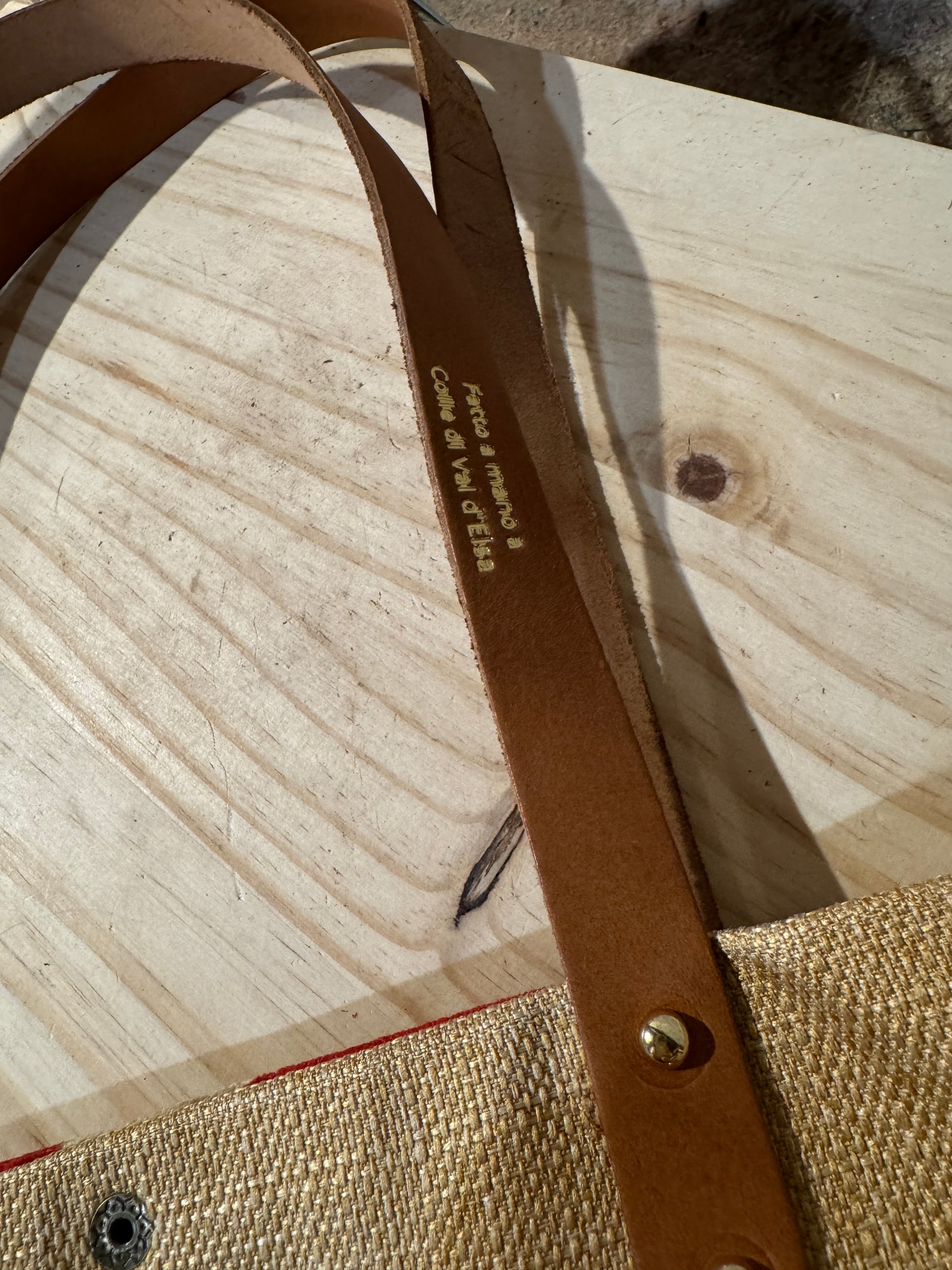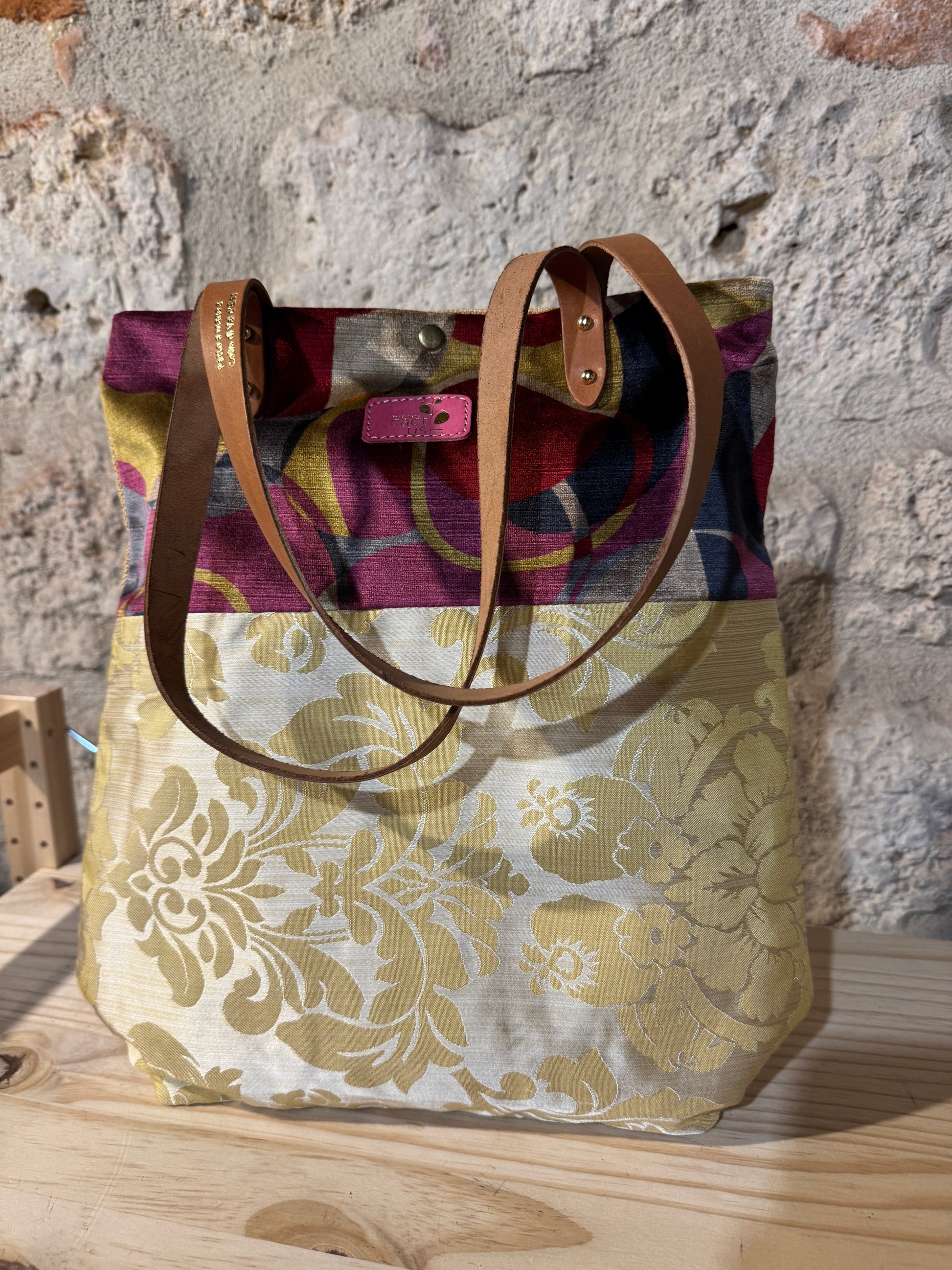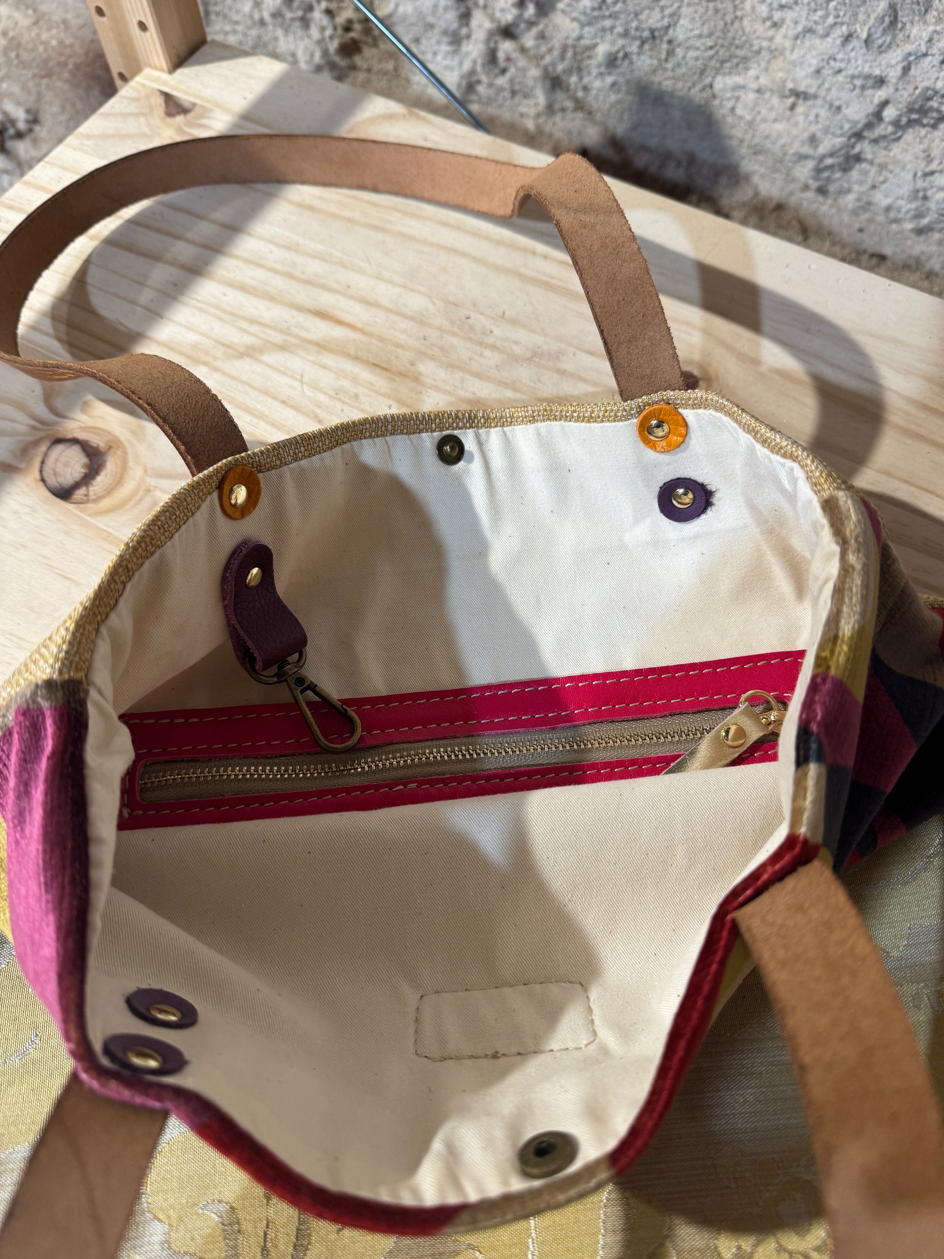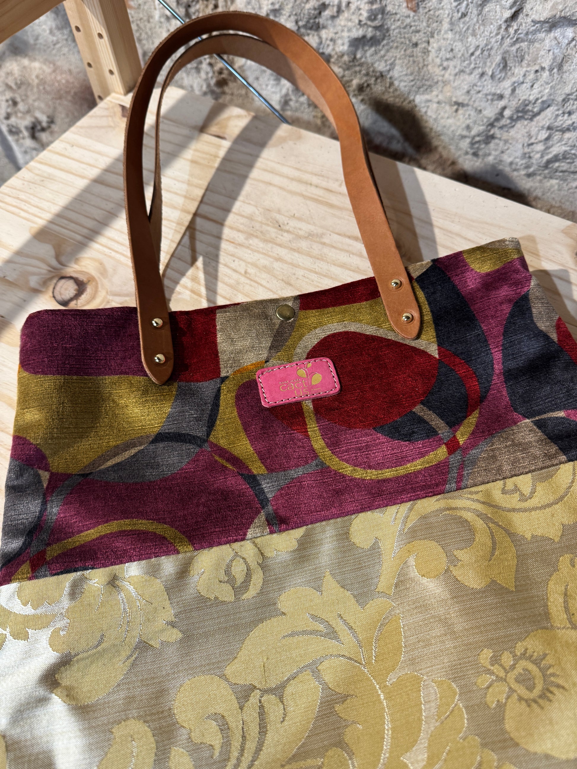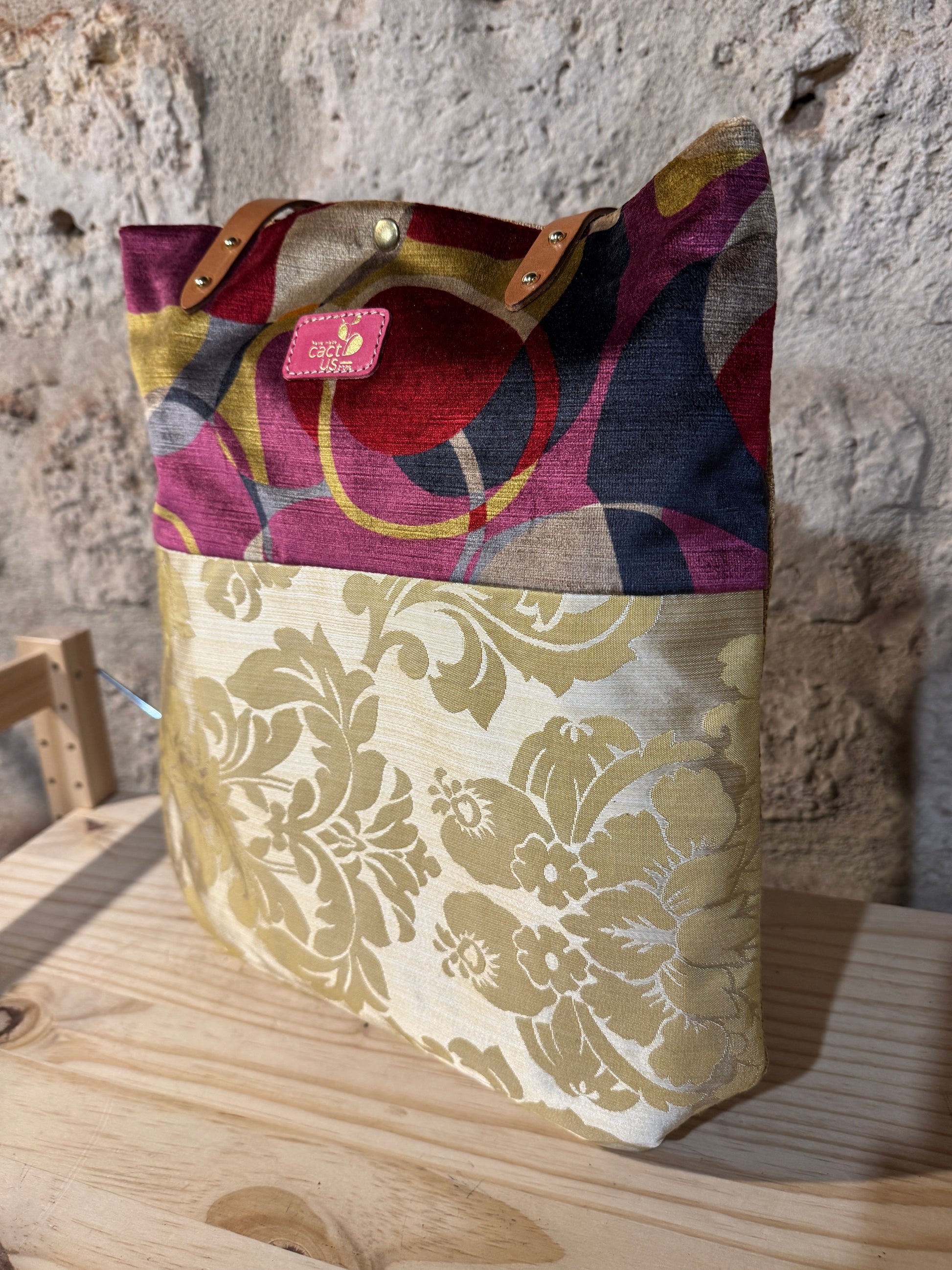 Realizzata in tessuto di tappezzeria con manici e laccetto tira zip in pelle.
