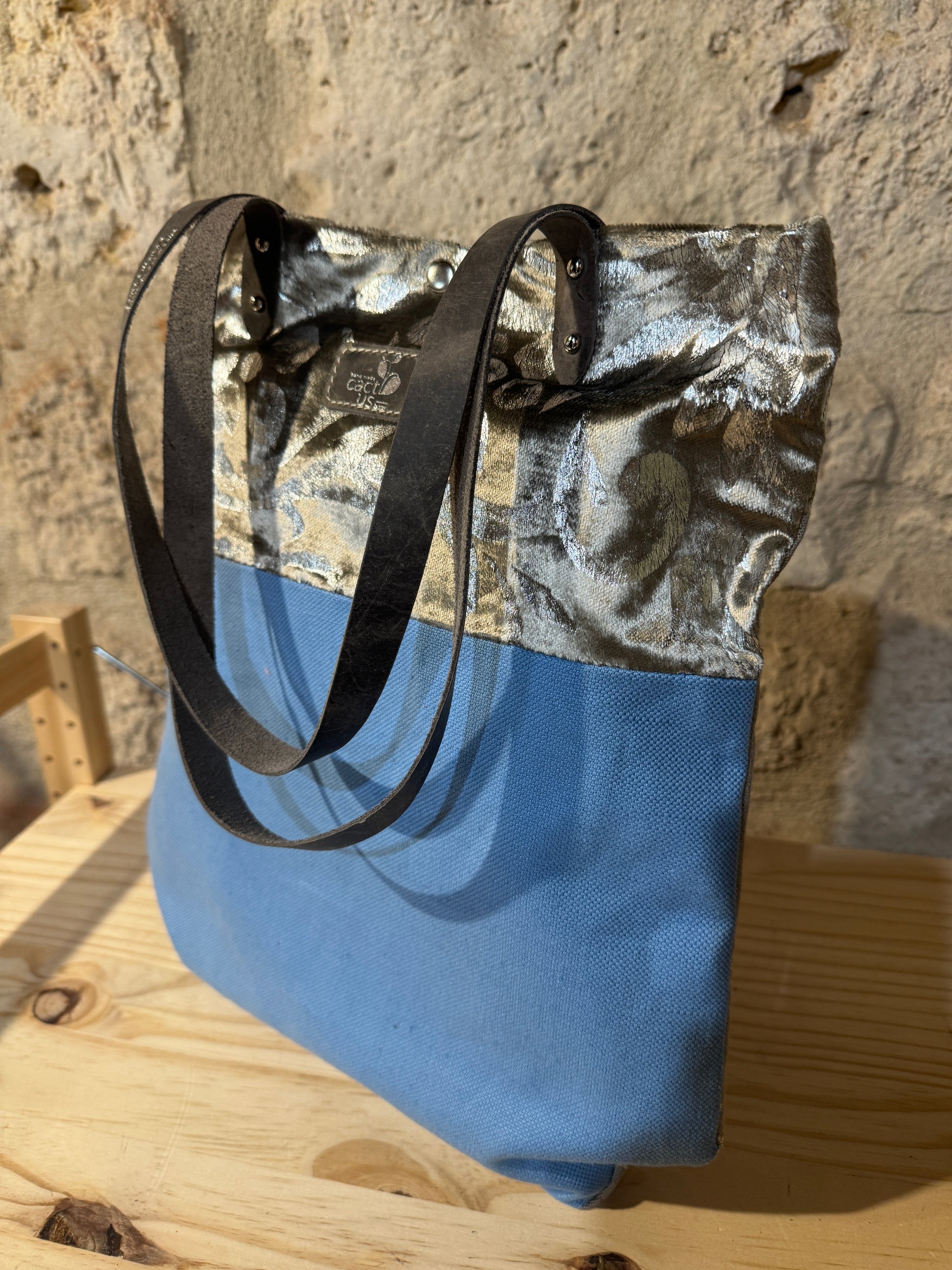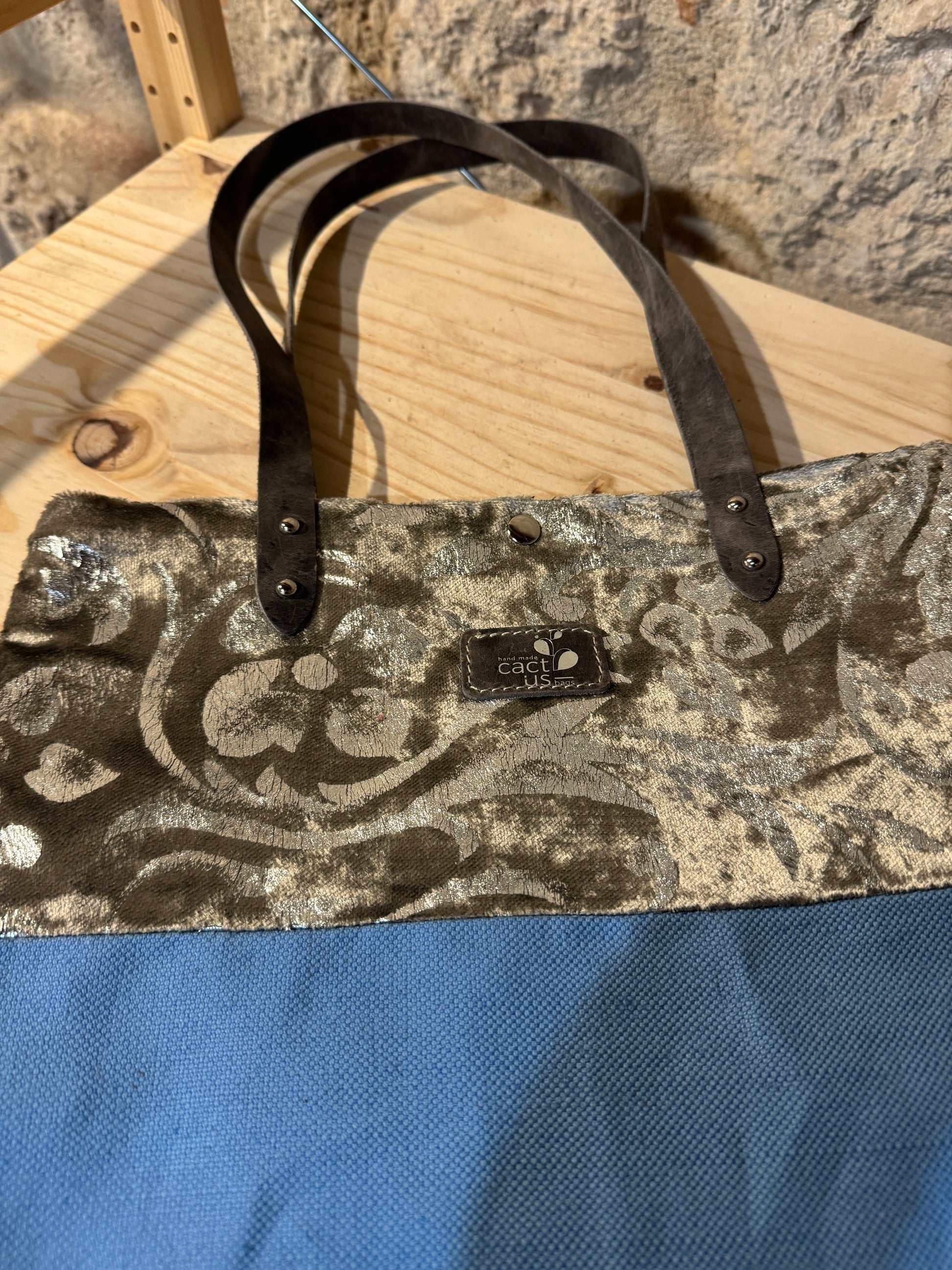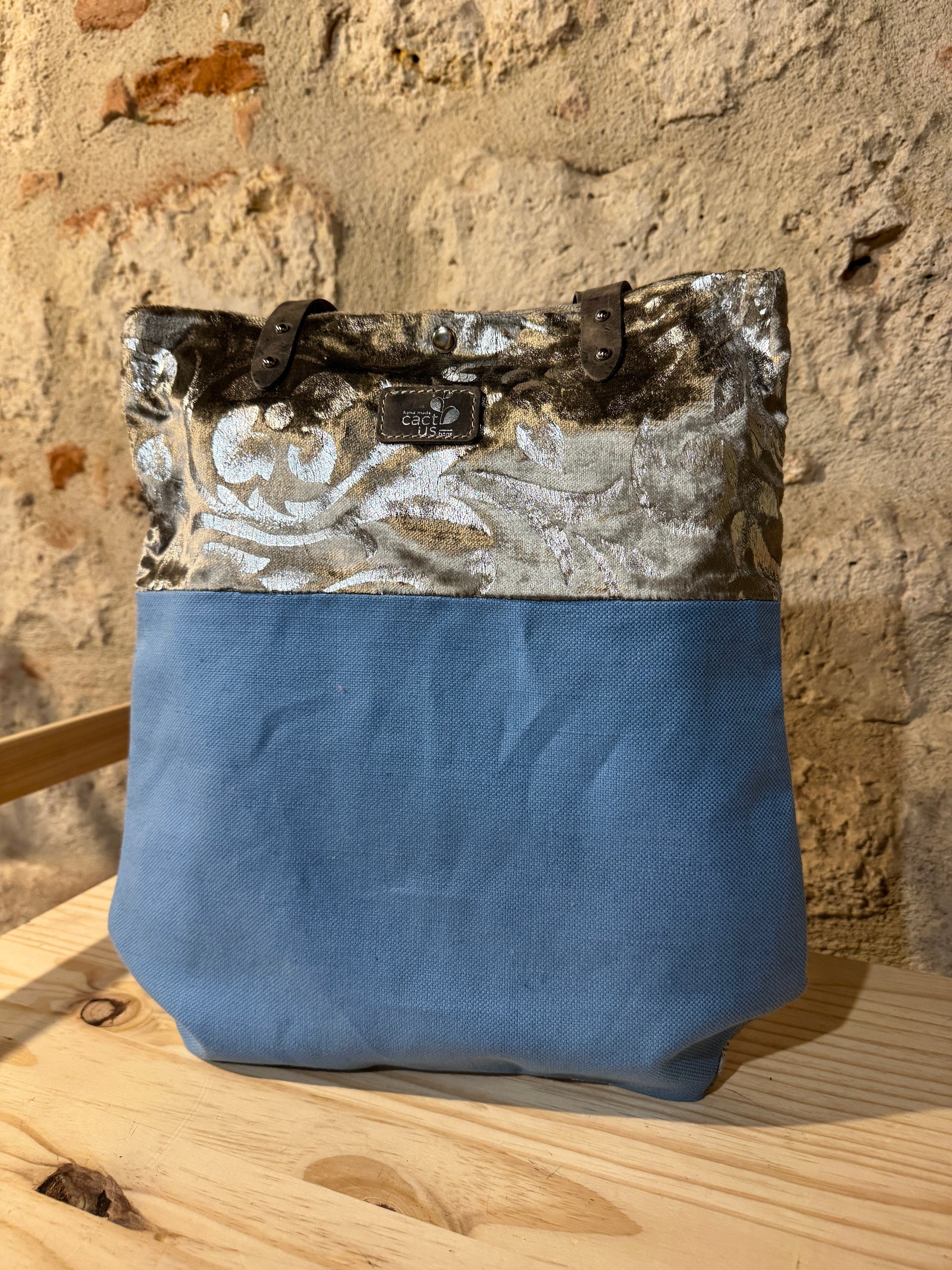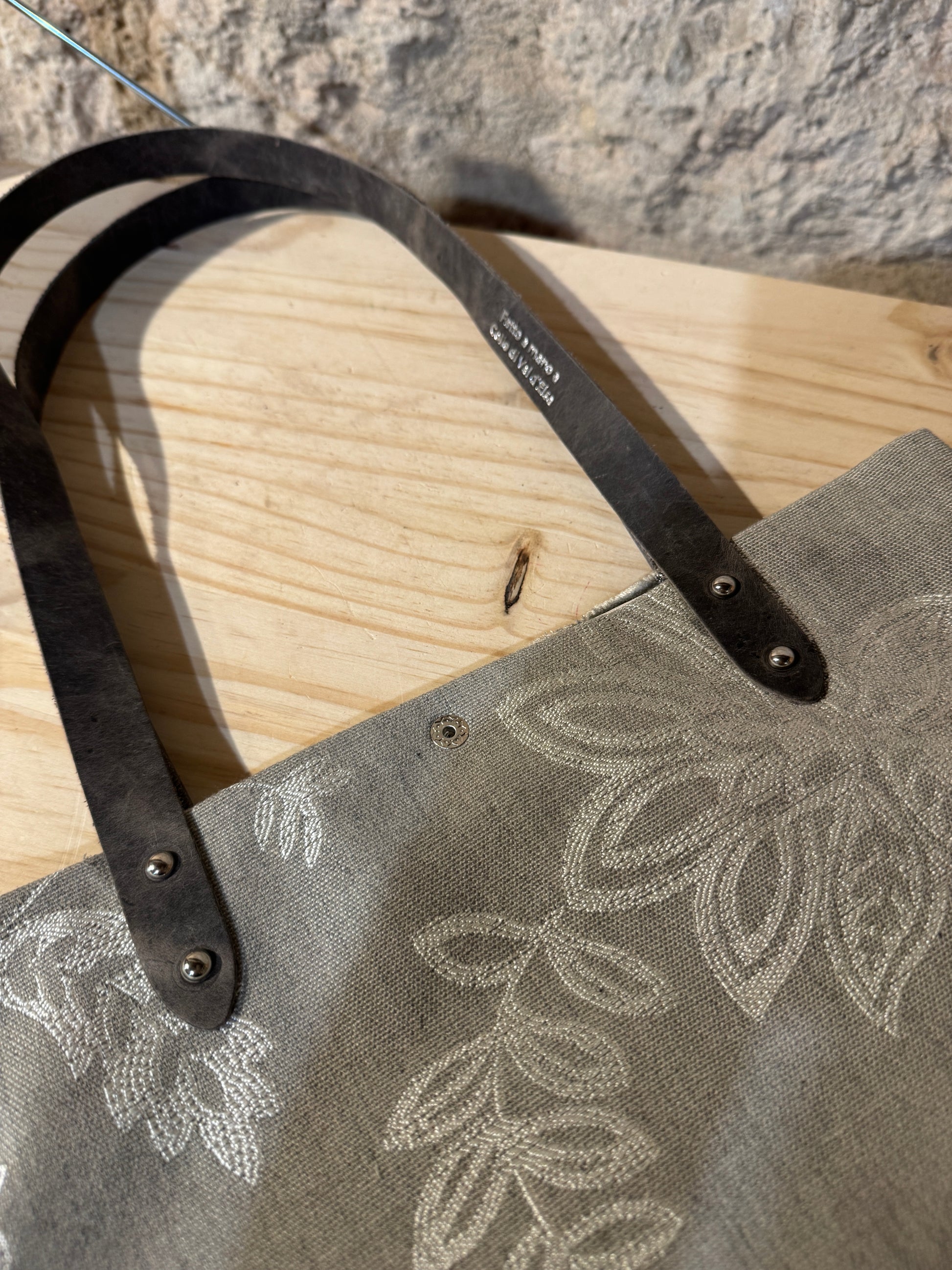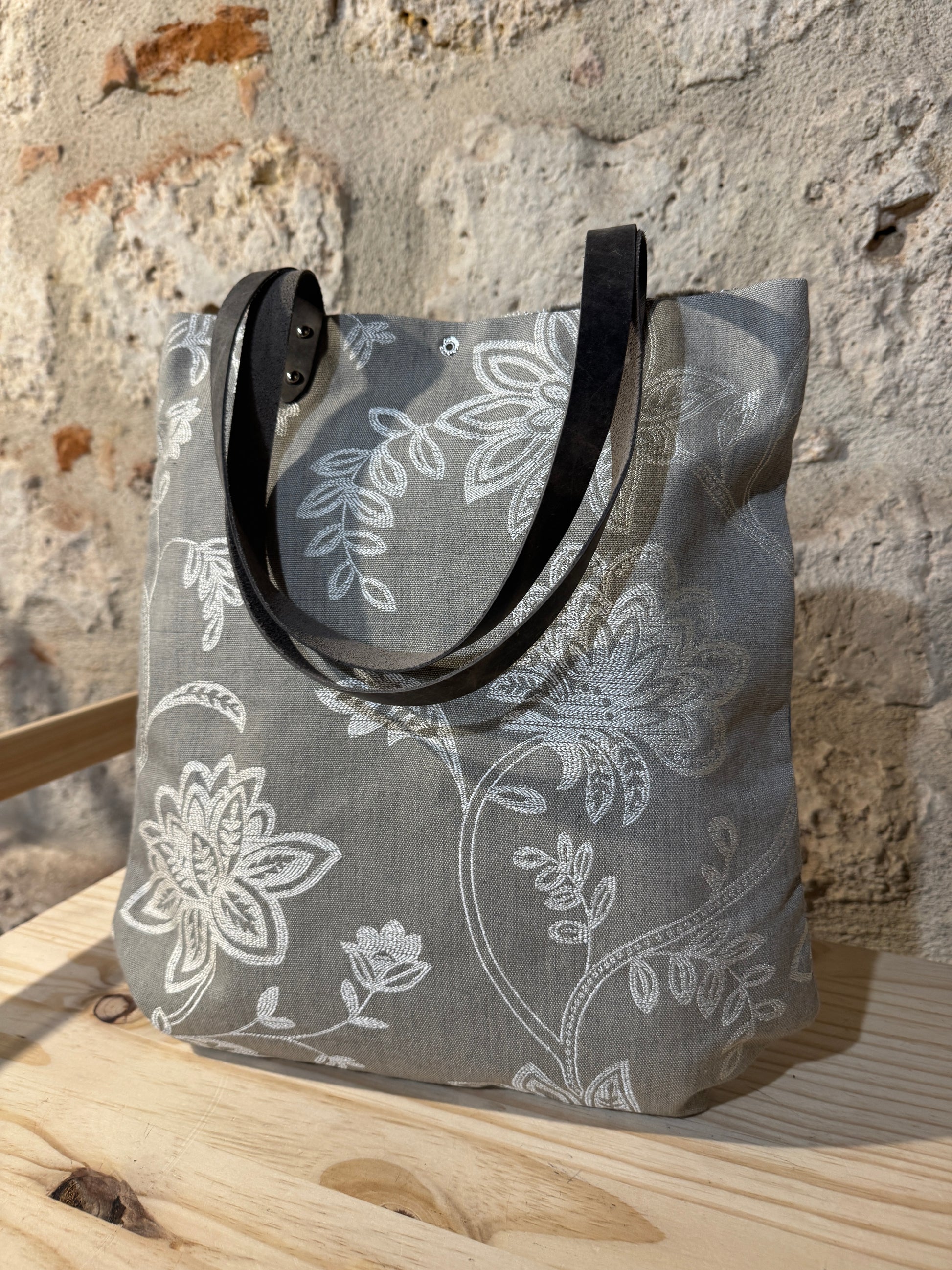 Realizzata in tessuto di tappezzeria con manici e laccetto tira zip in pelle.