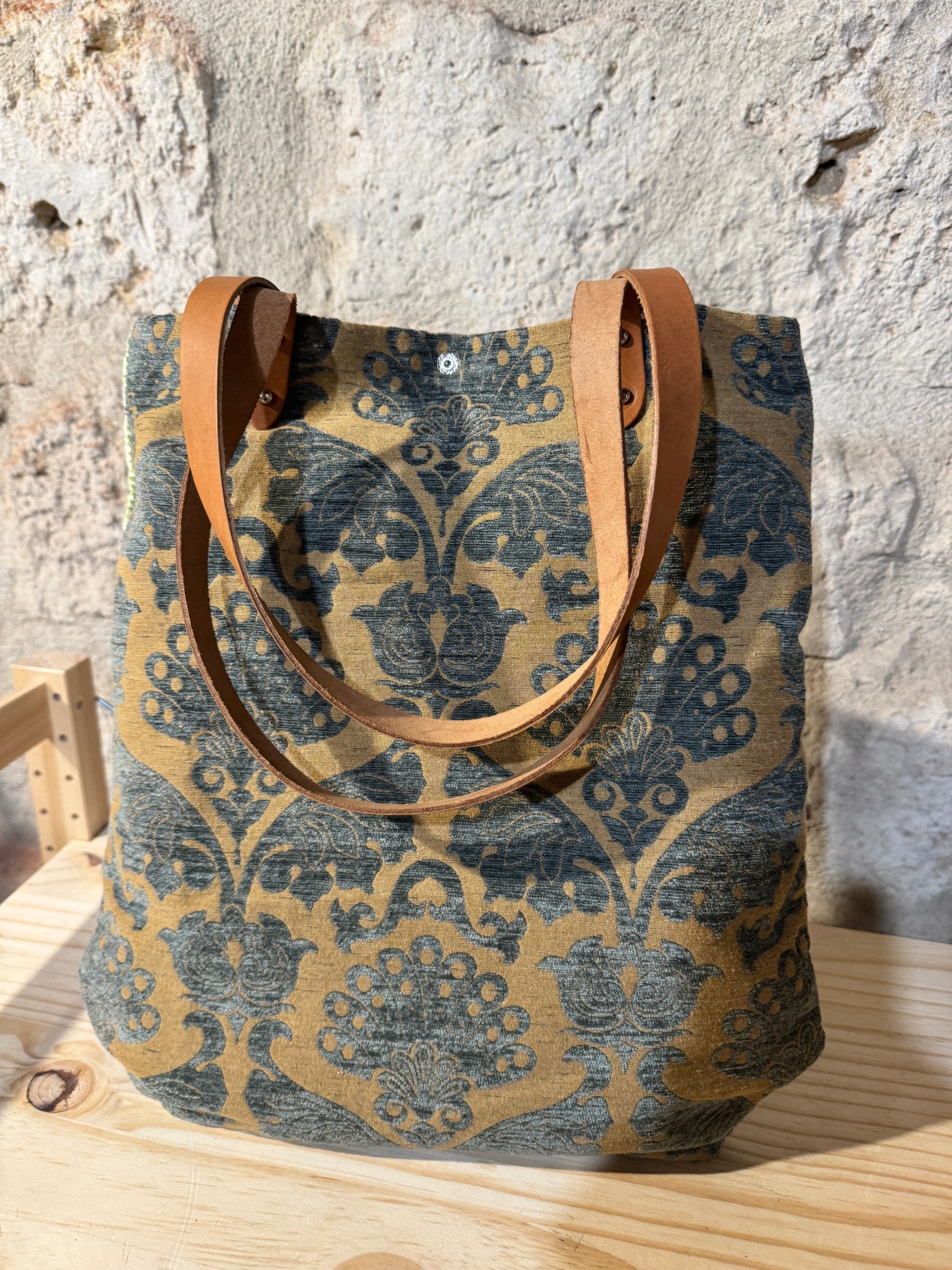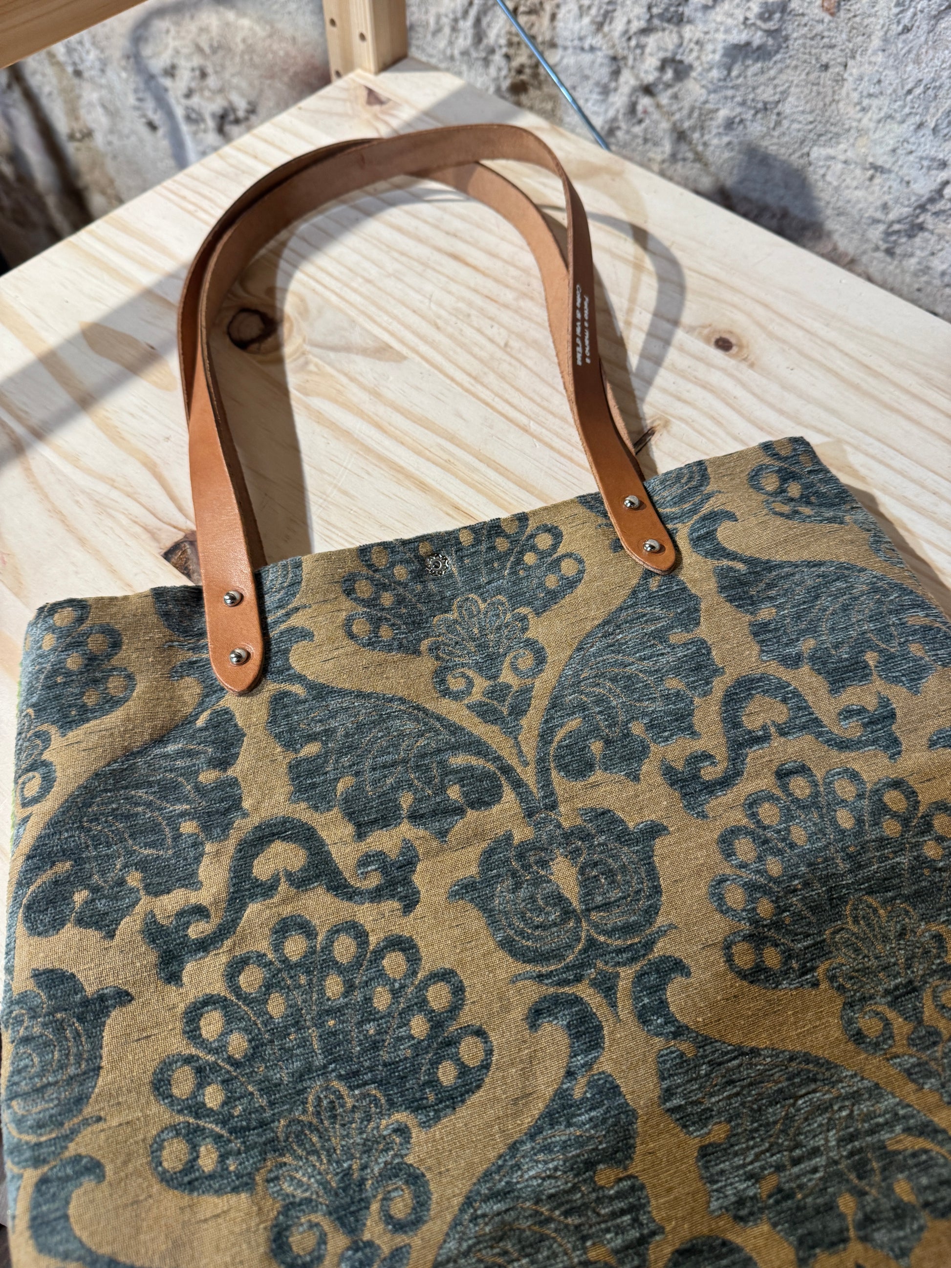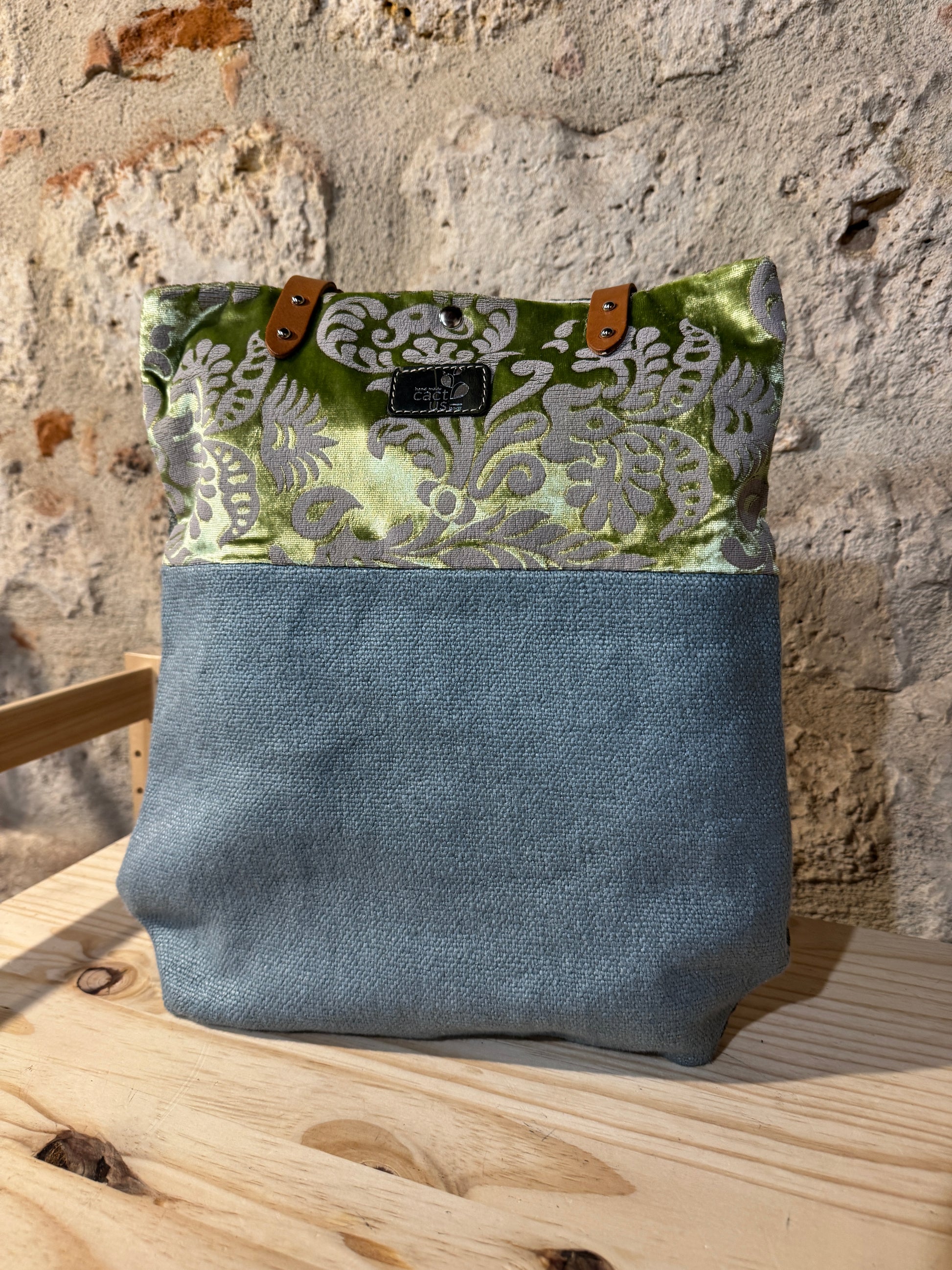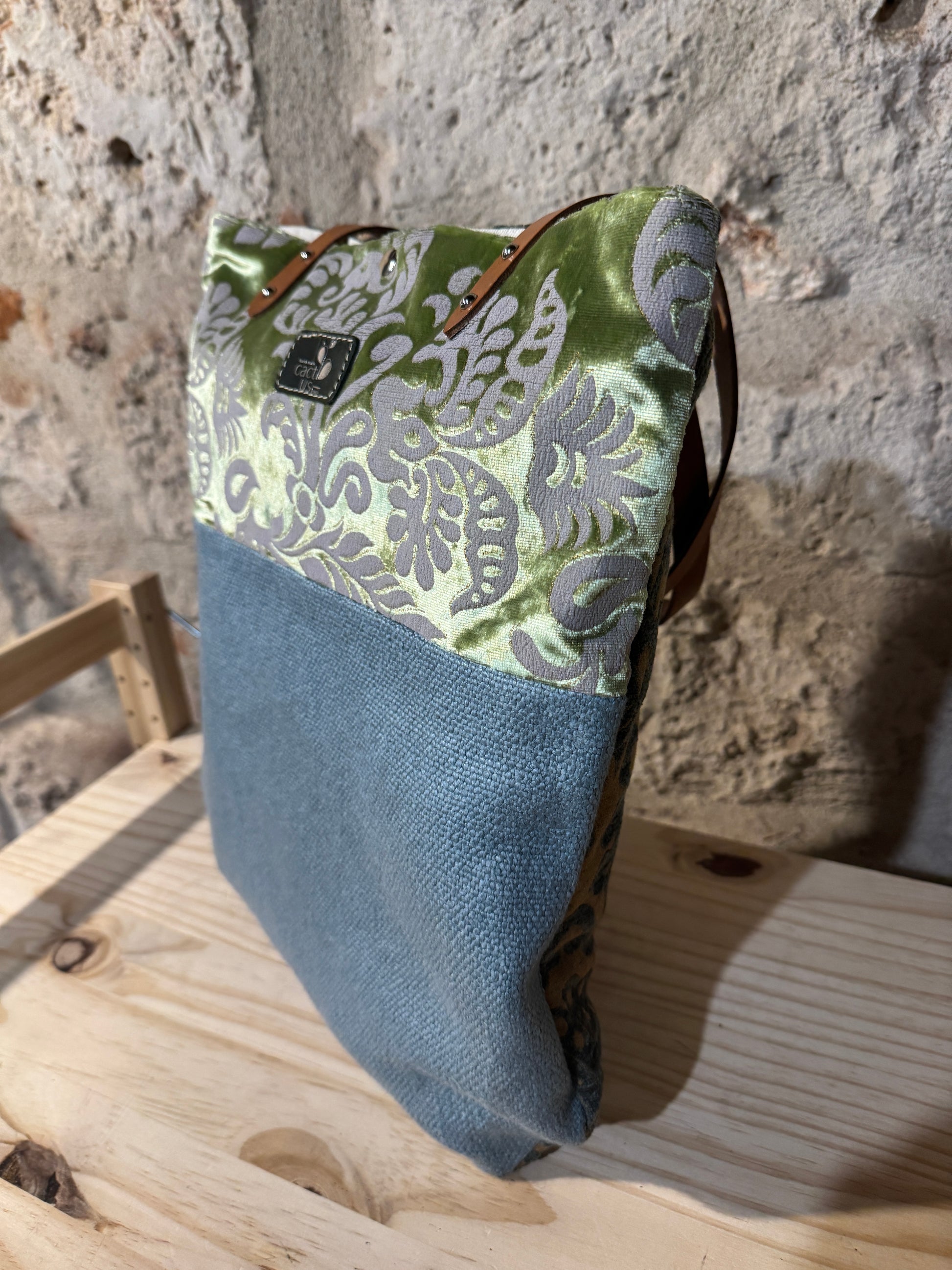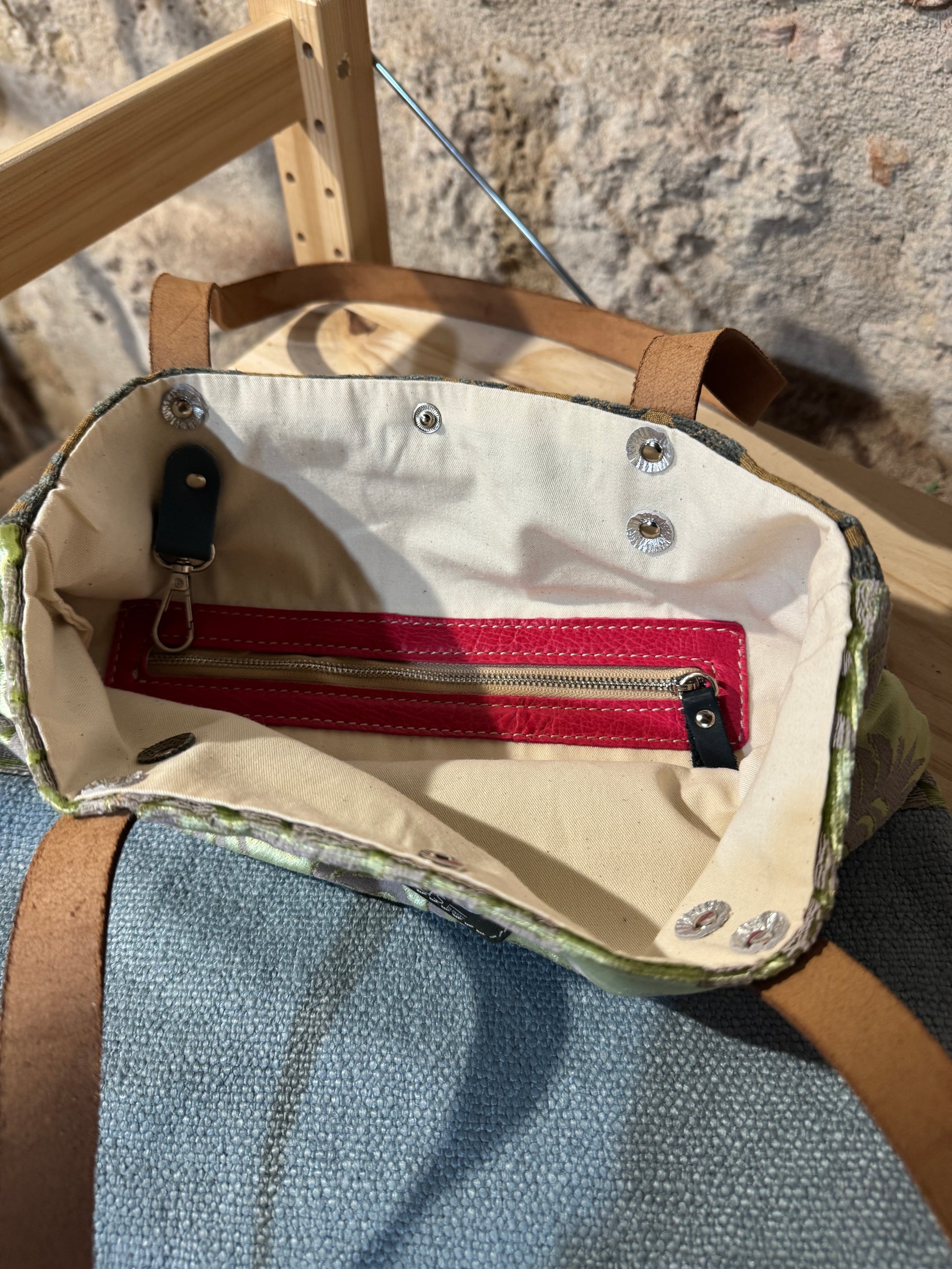 Realizzata in tessuto di tappezzeria con manici e laccetto tira zip in pelle.