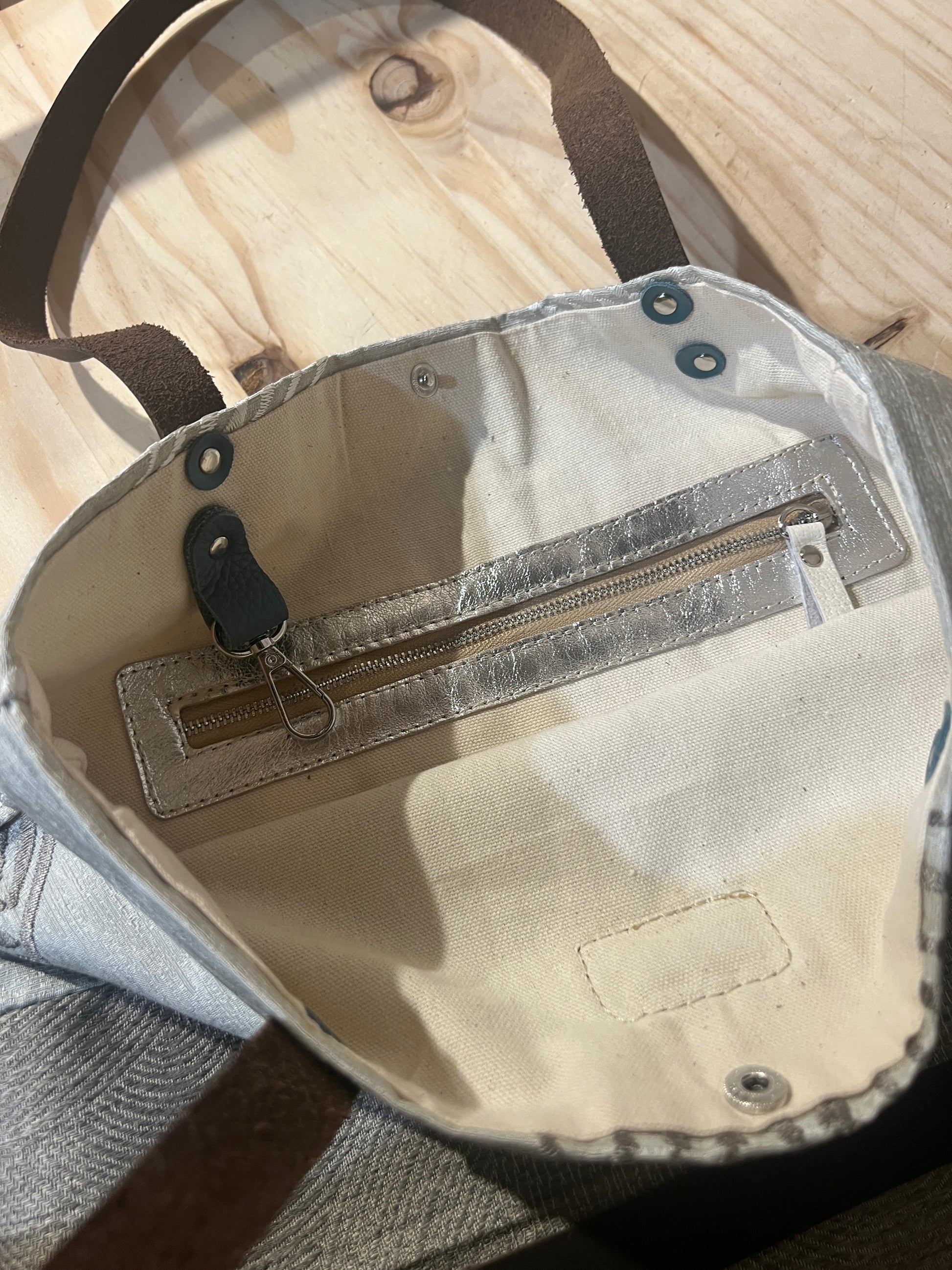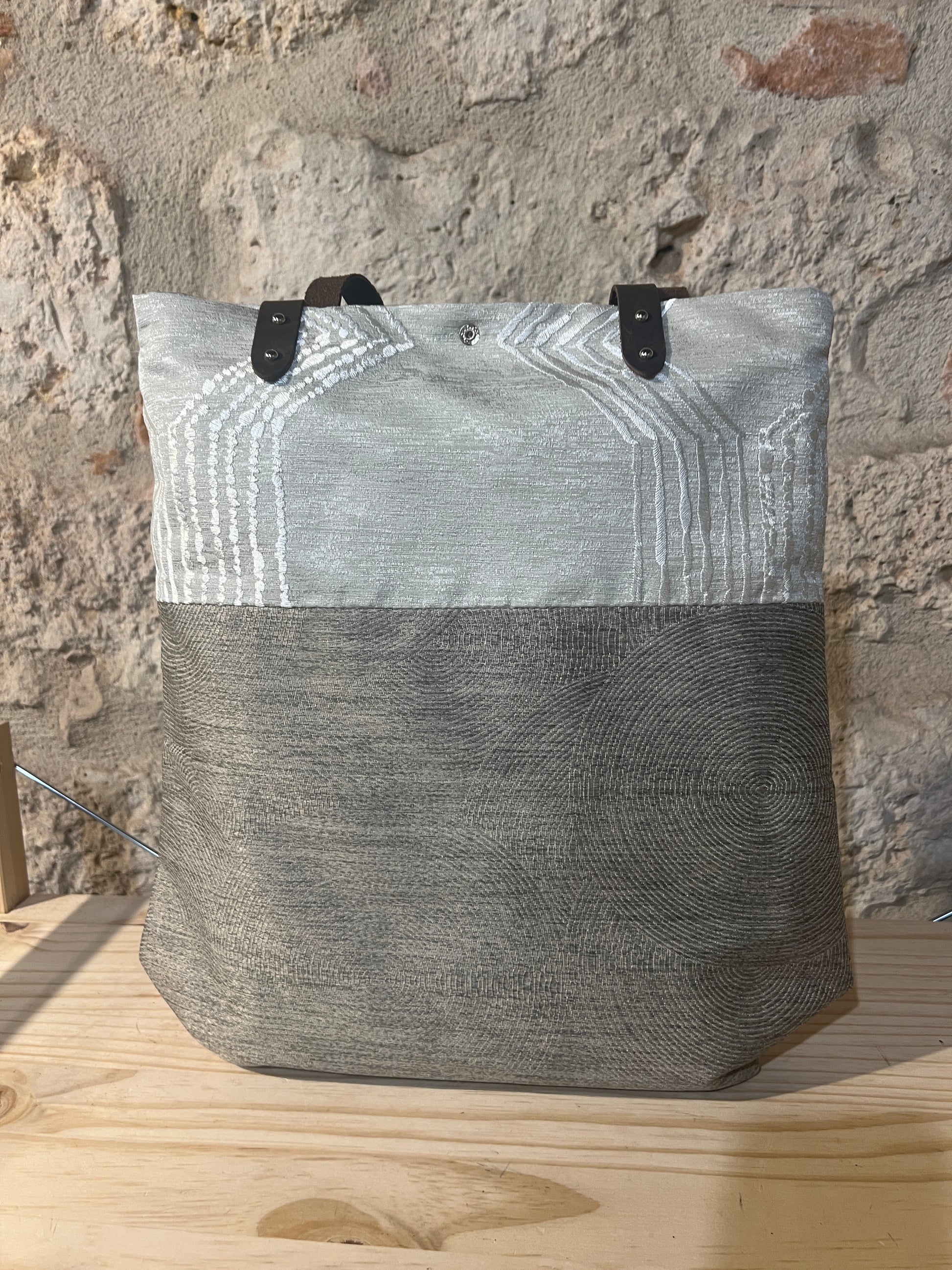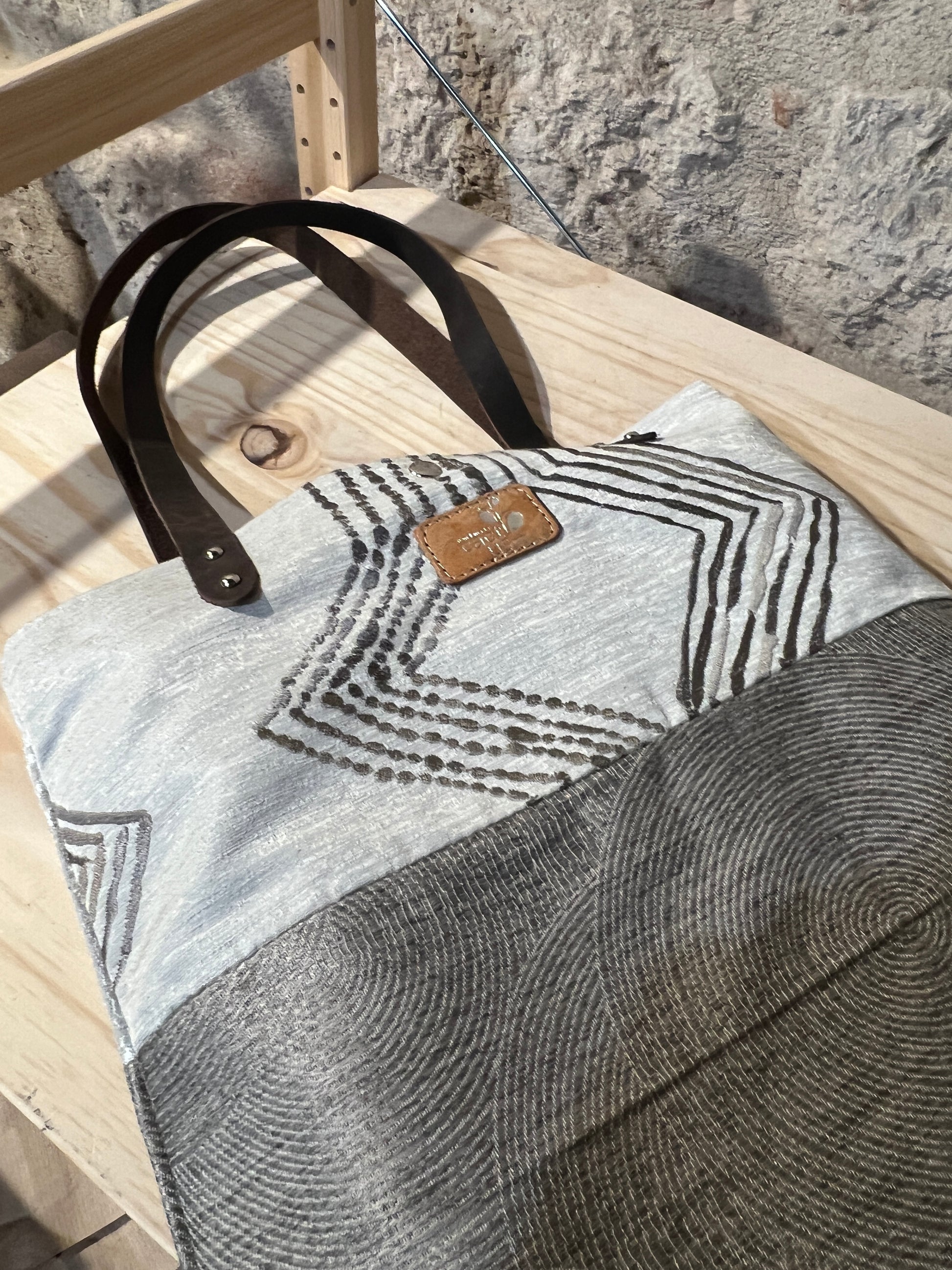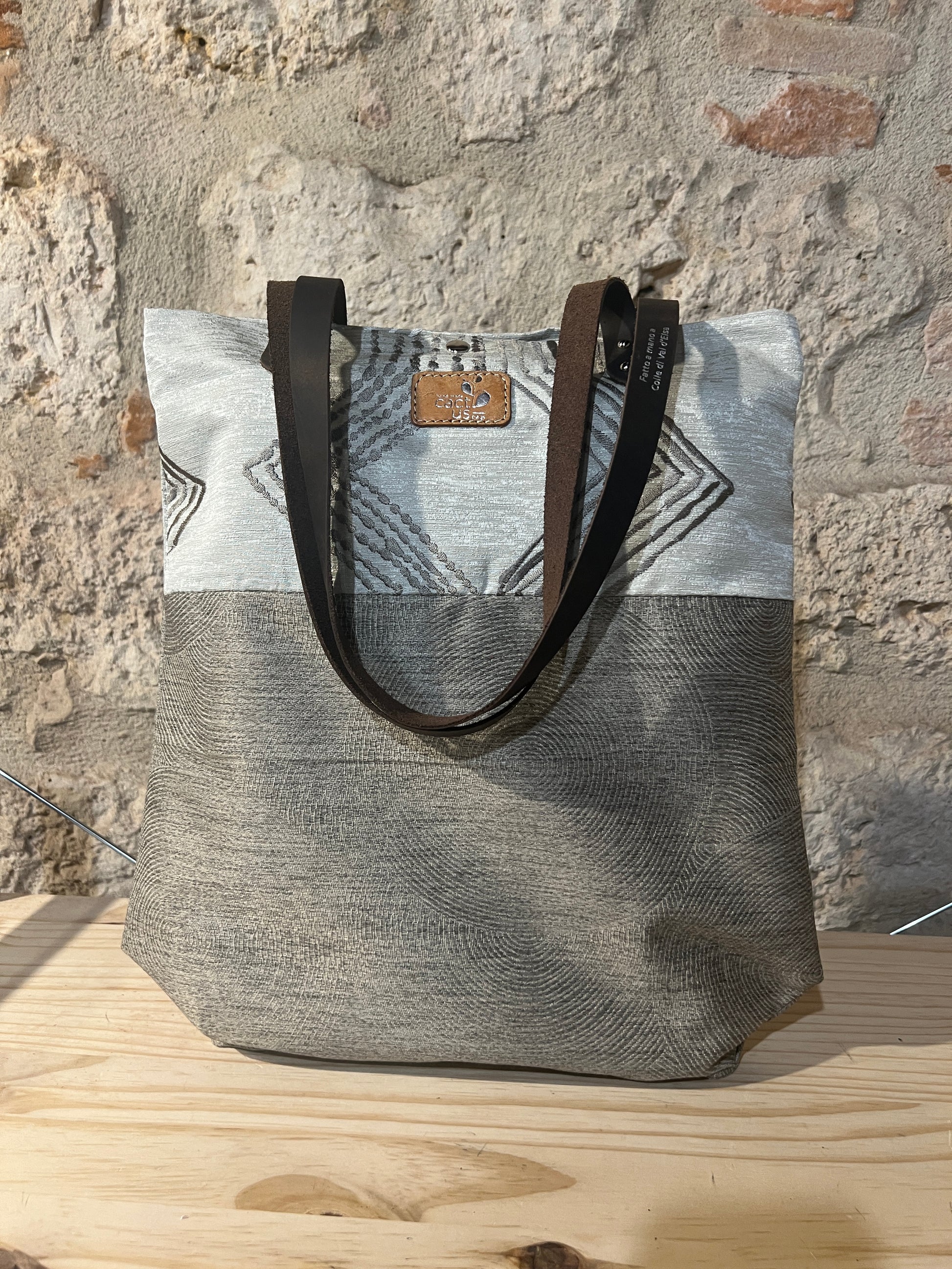 Realizzata in tessuto di tappezzeria con manici e laccetto tira zip in pelle.