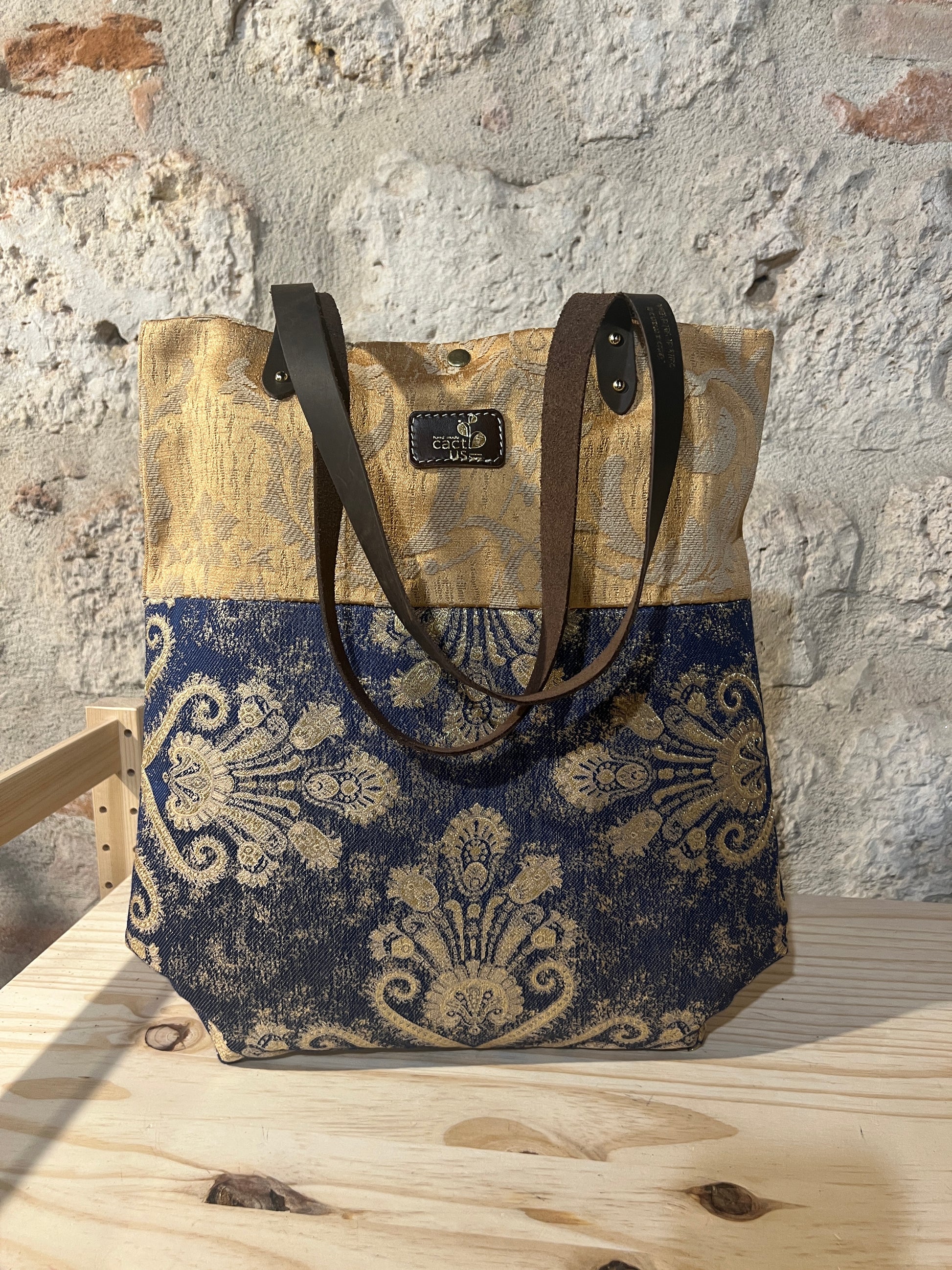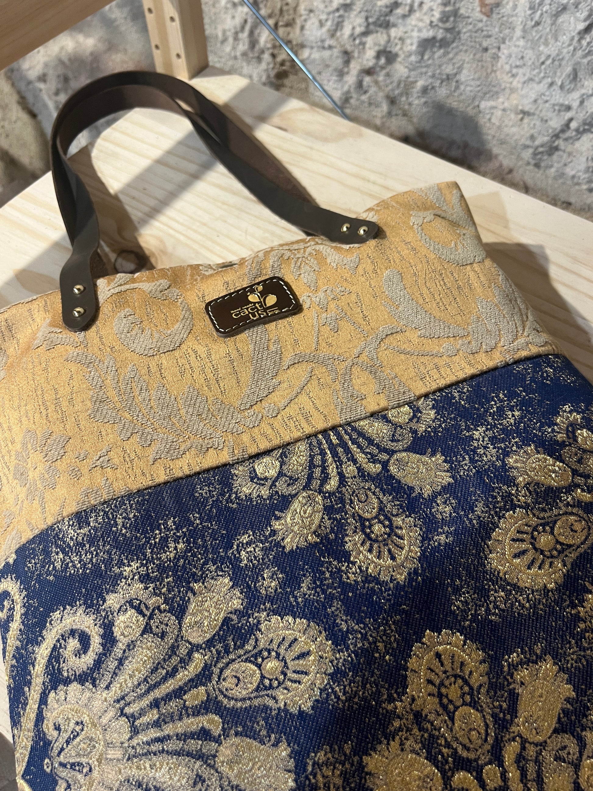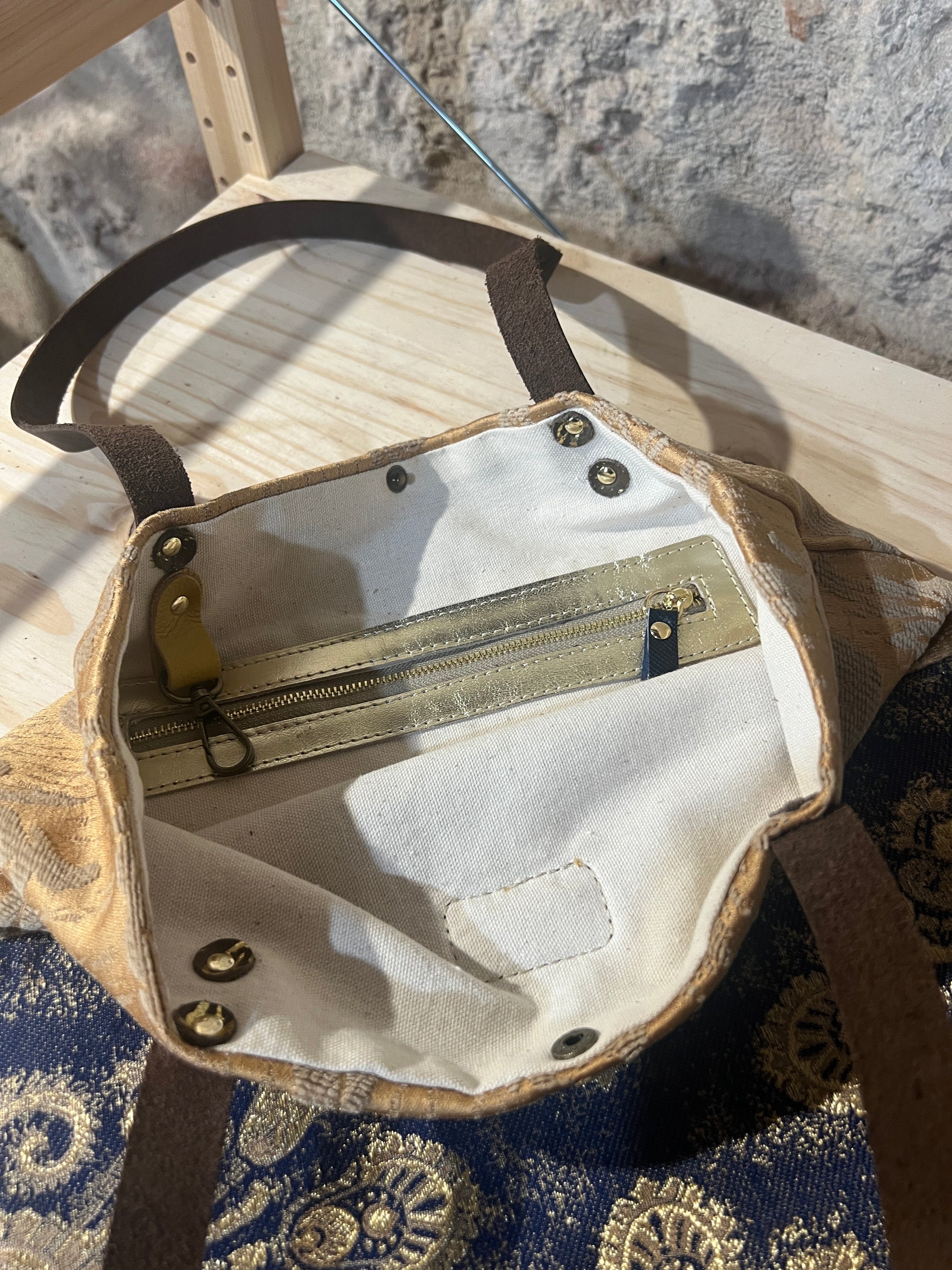 Realizzata in tessuto di tappezzeria con manici e laccetto tira zip in pelle.