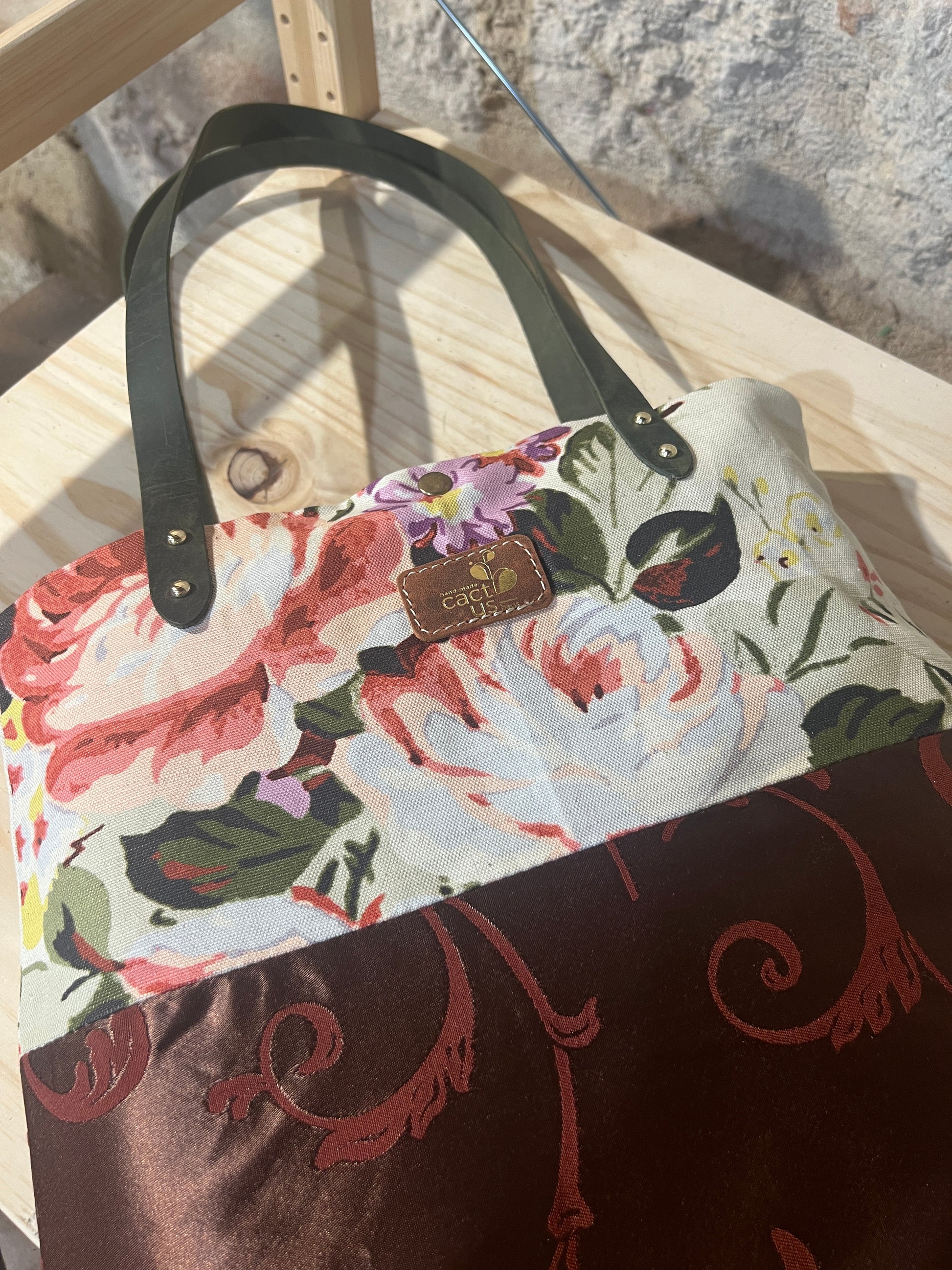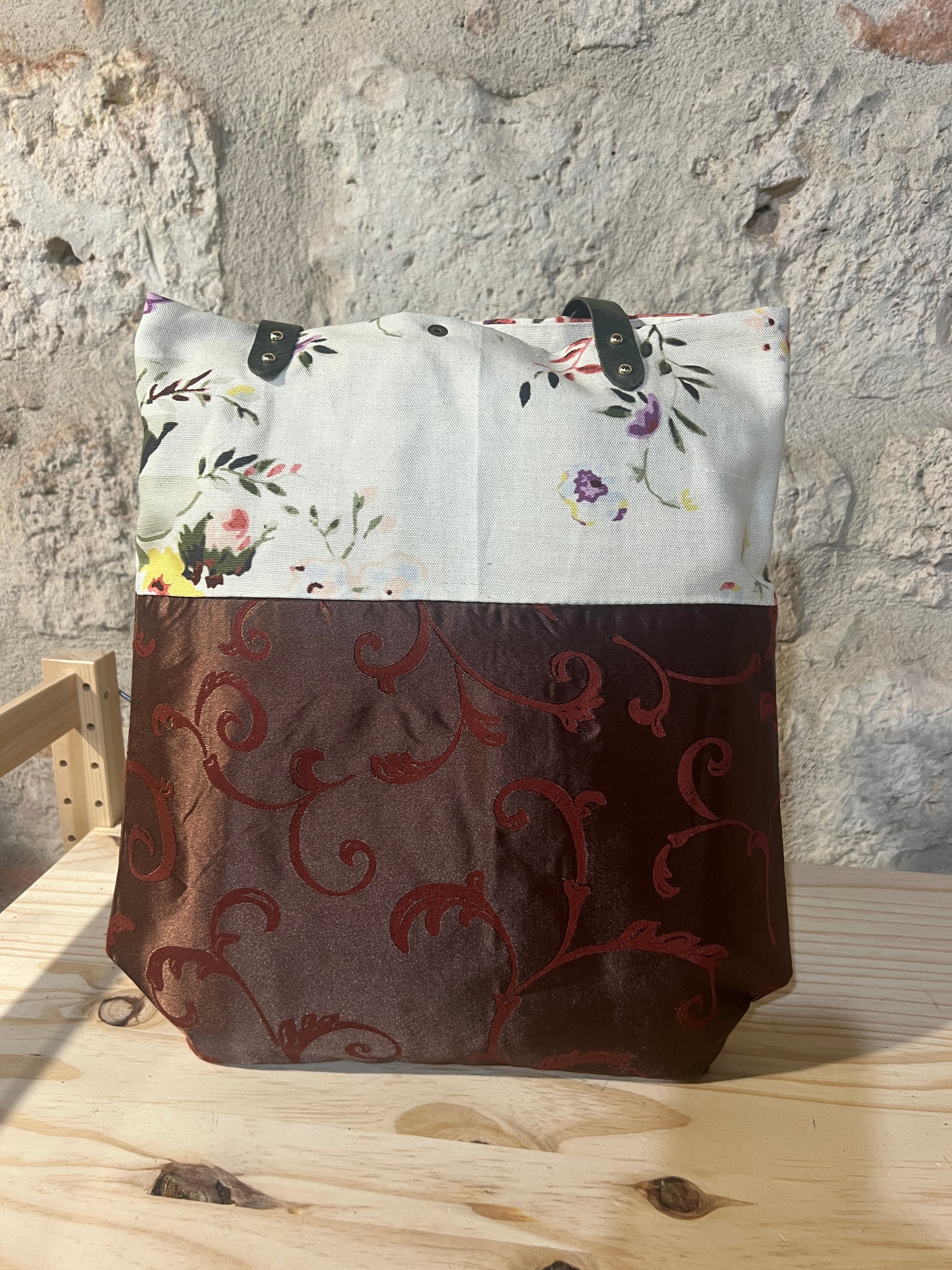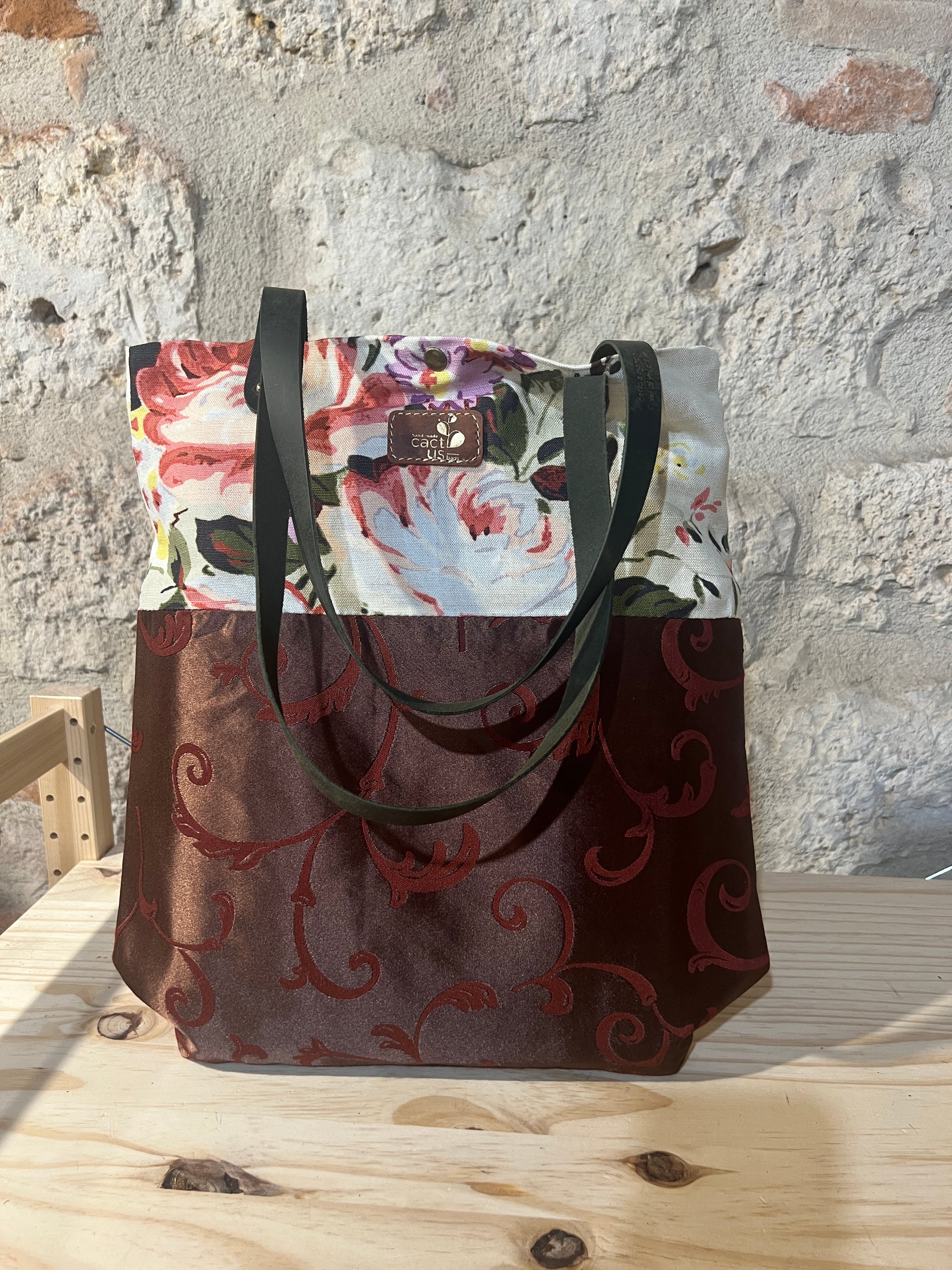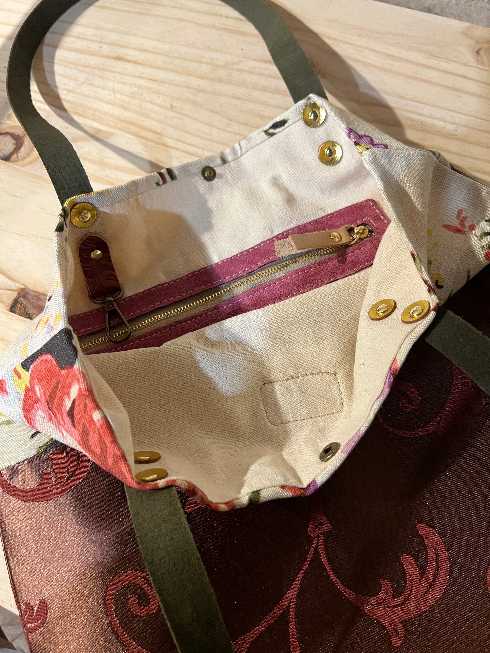 Realizzata in tessuto di tappezzeria con manici e laccetto tira zip in pelle.