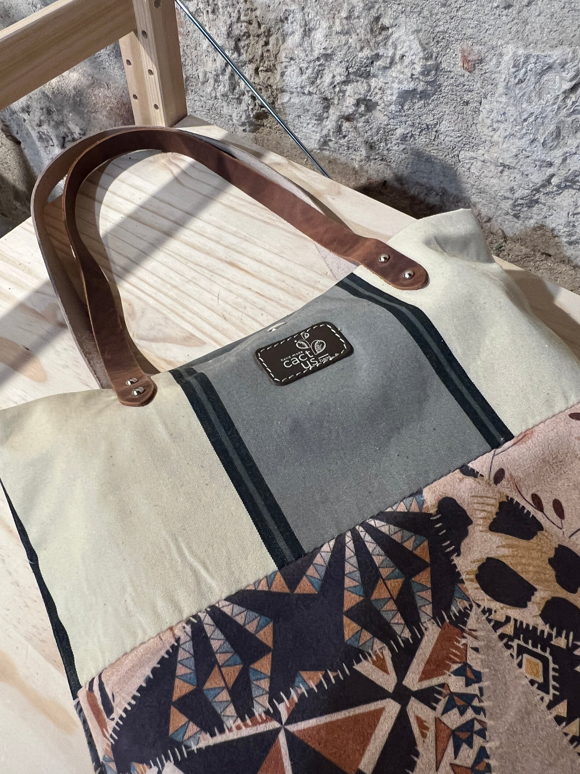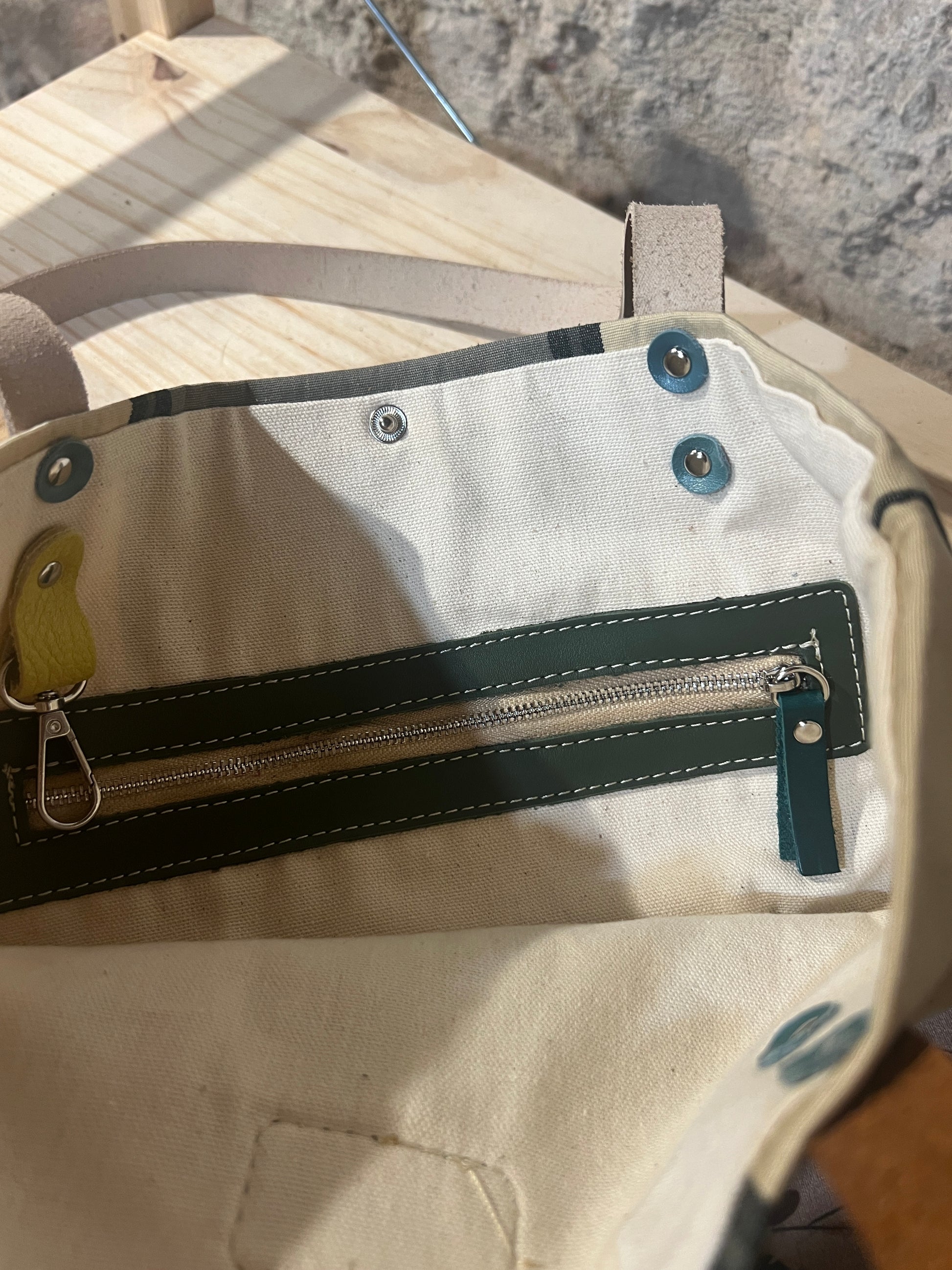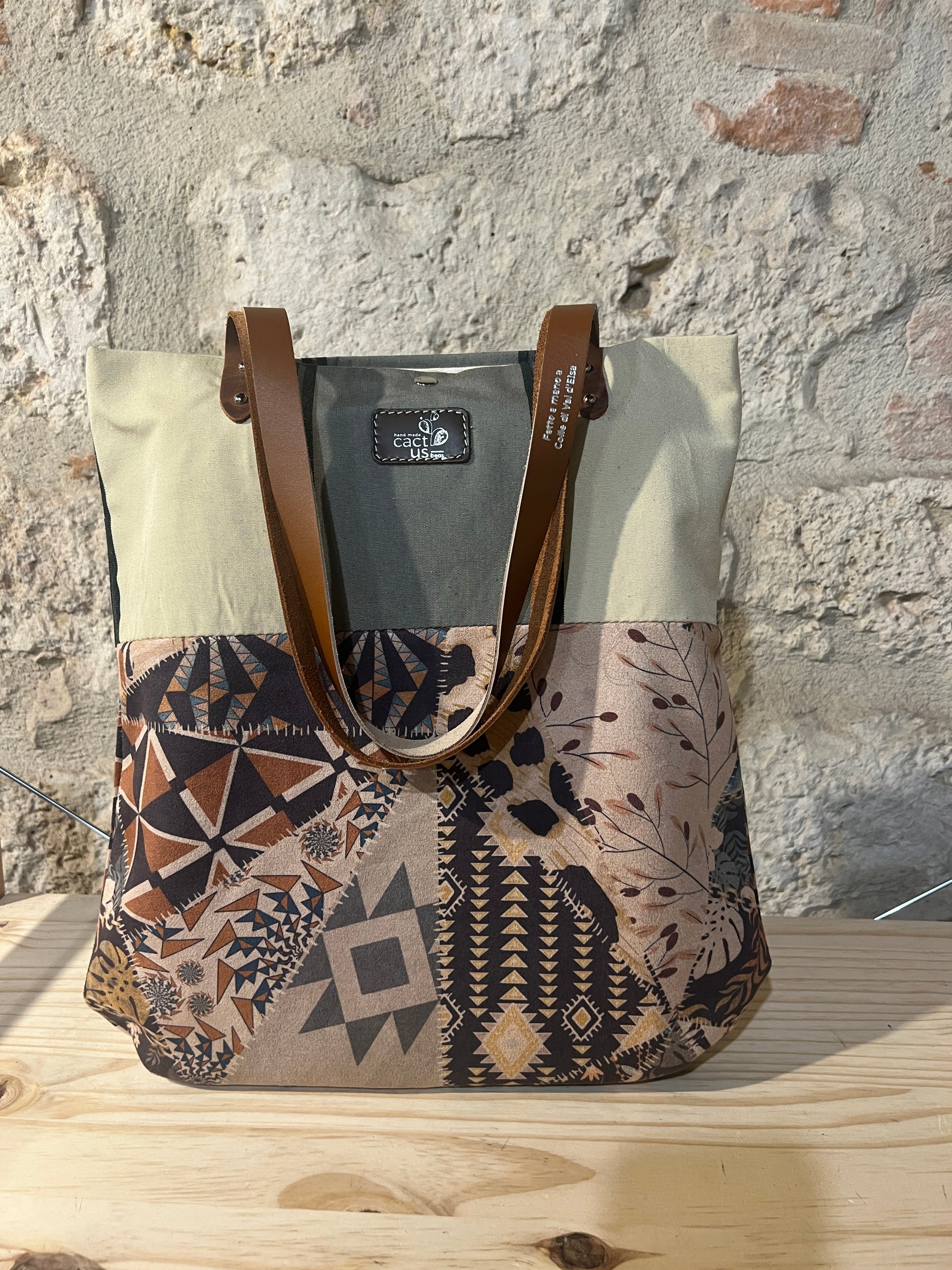 Realizzata in tessuto di tappezzeria con manici e laccetto tira zip in pelle.