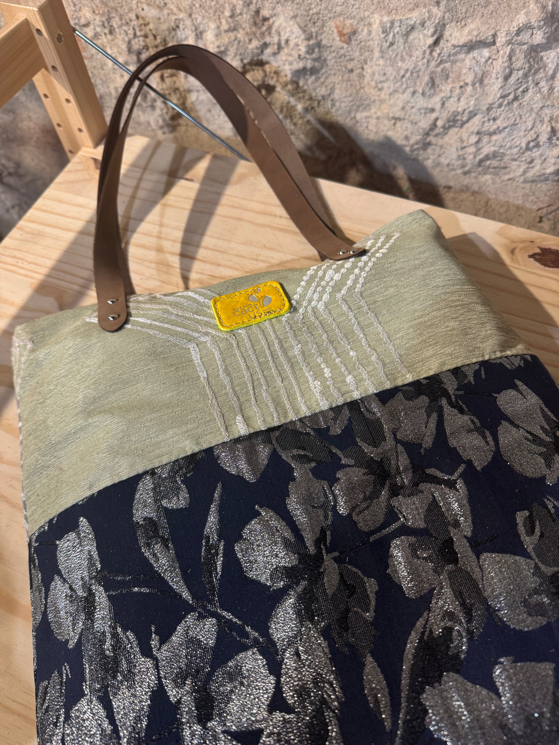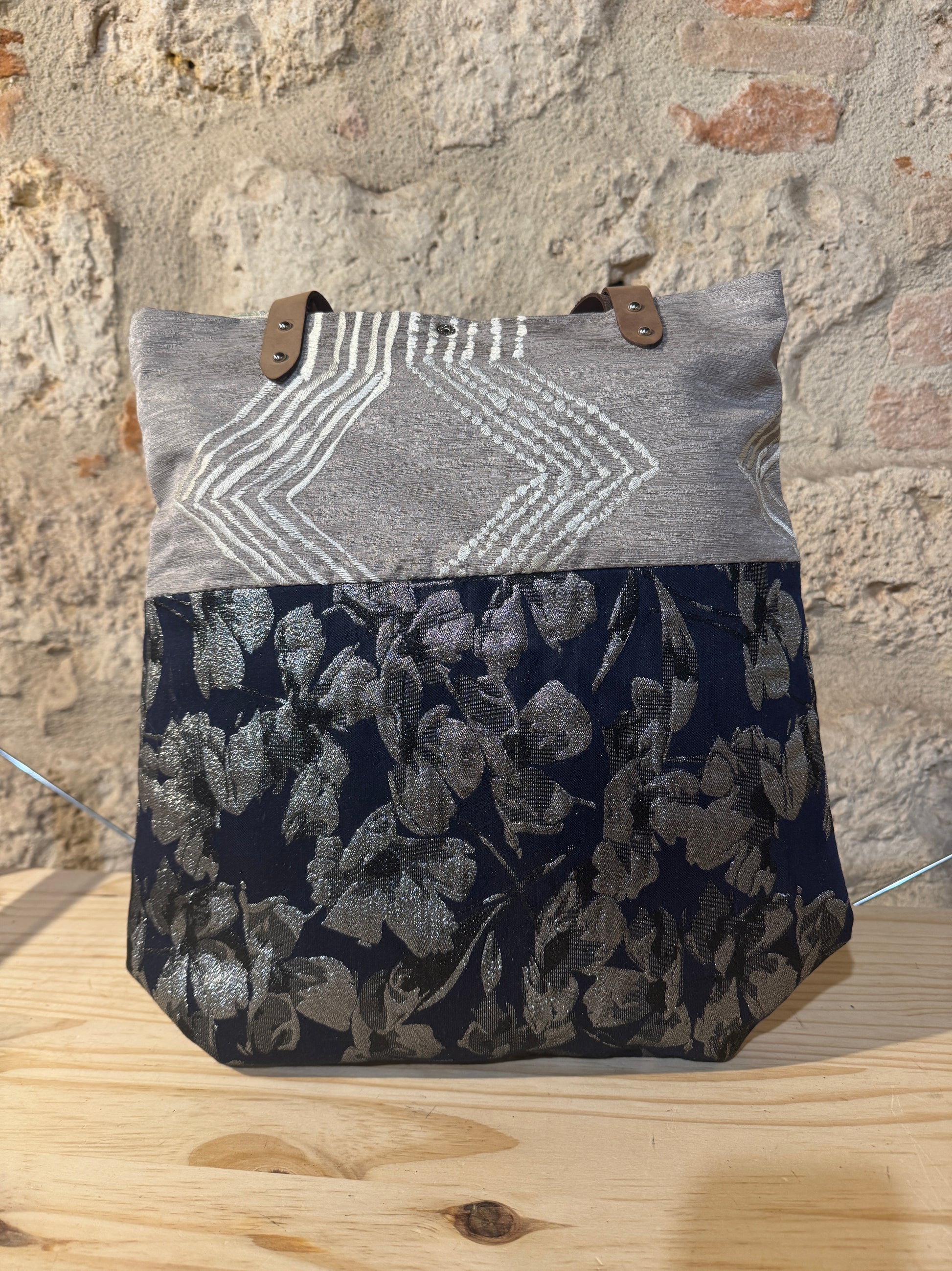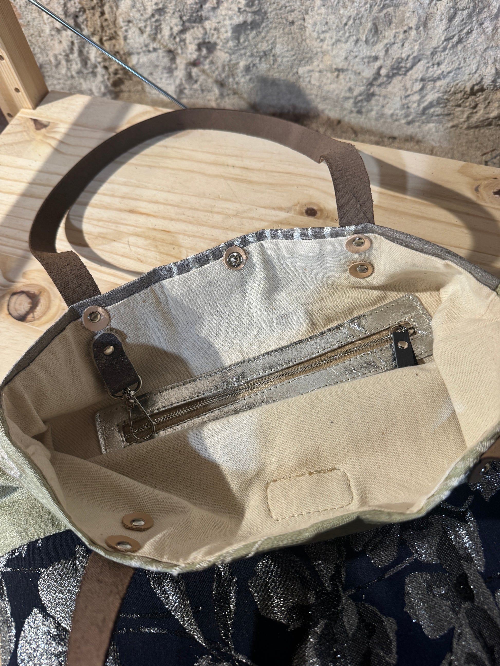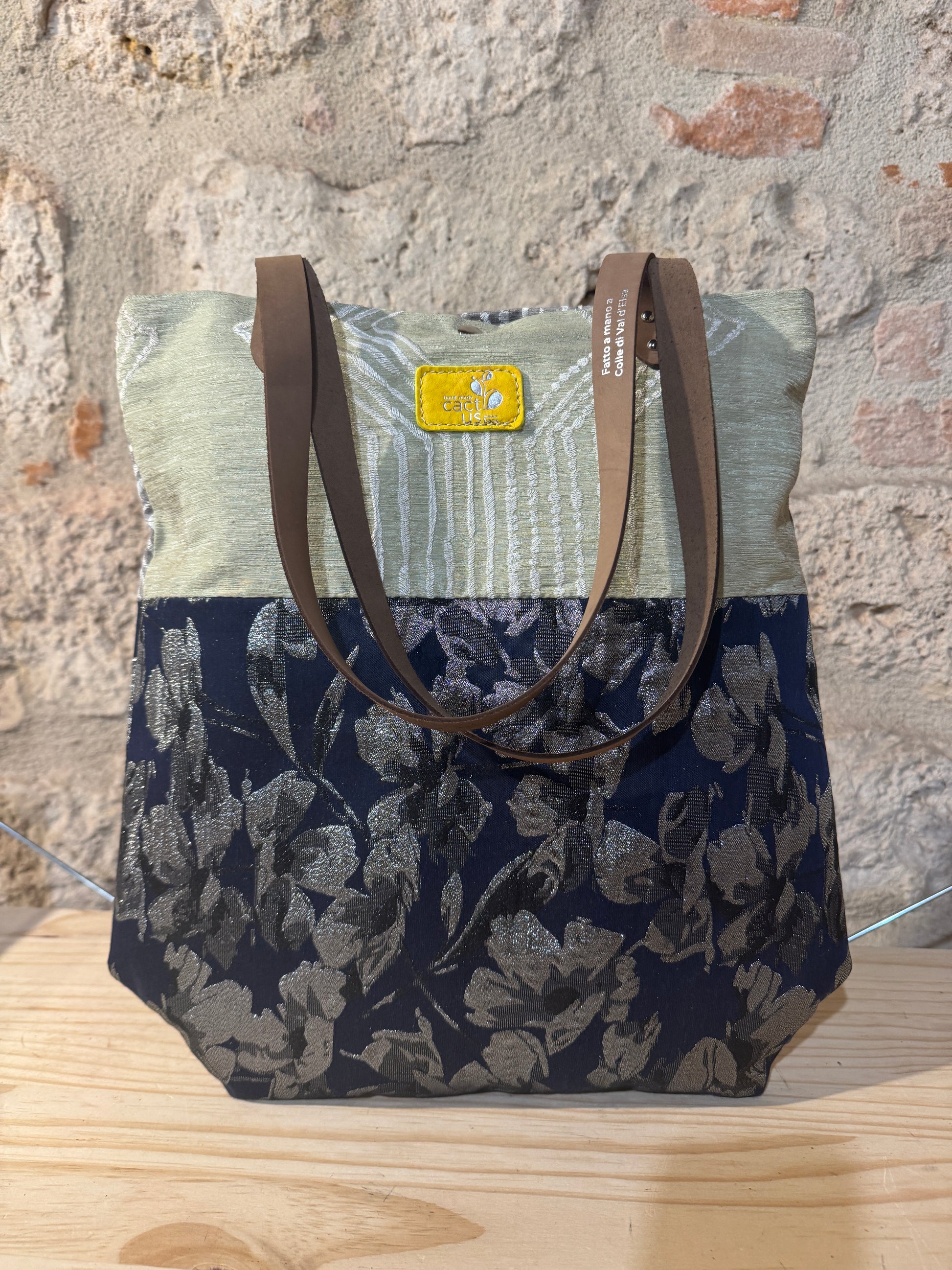 Realizzata in tessuto di tappezzeria con manici e laccetto tira zip in pelle.