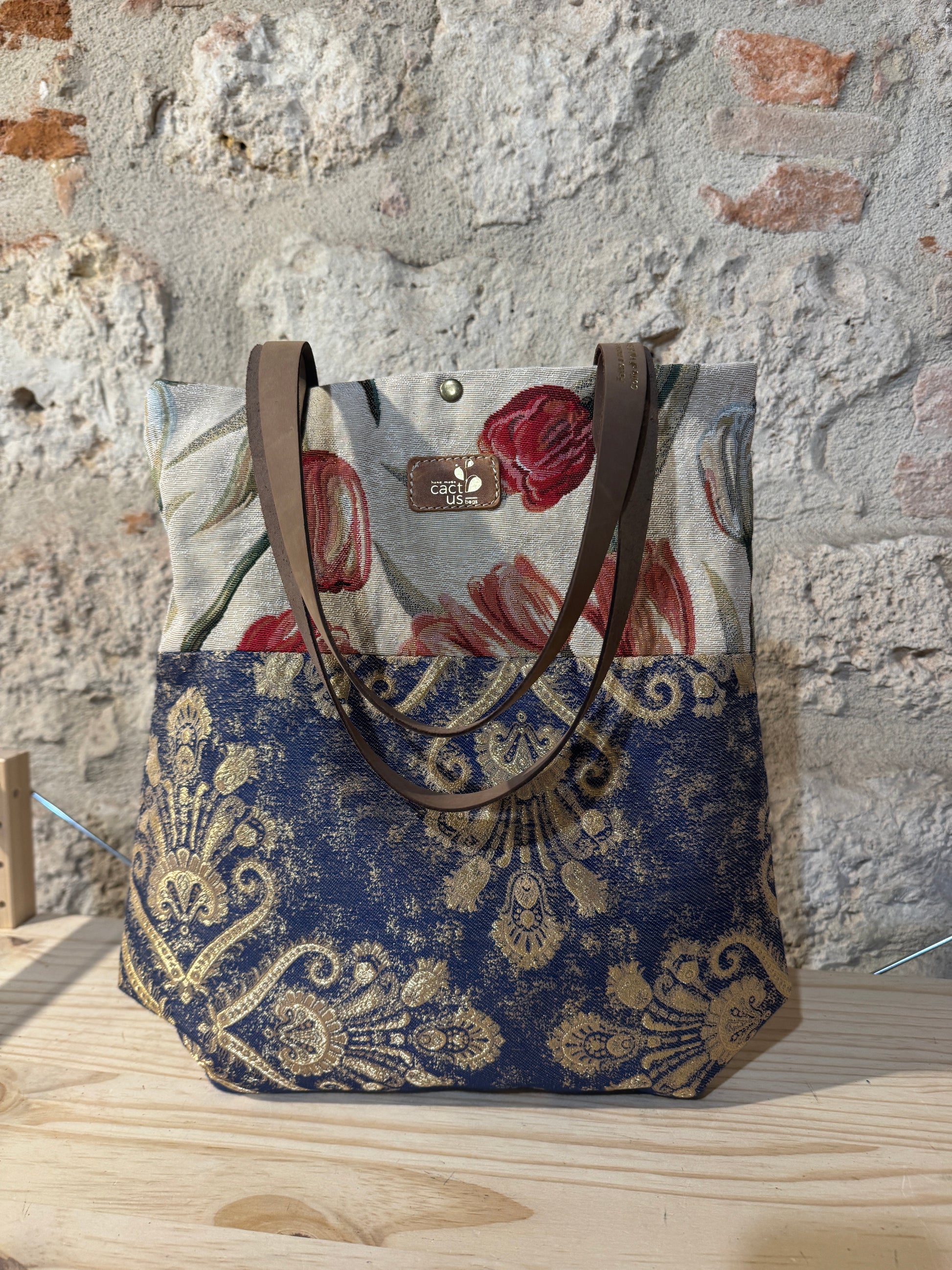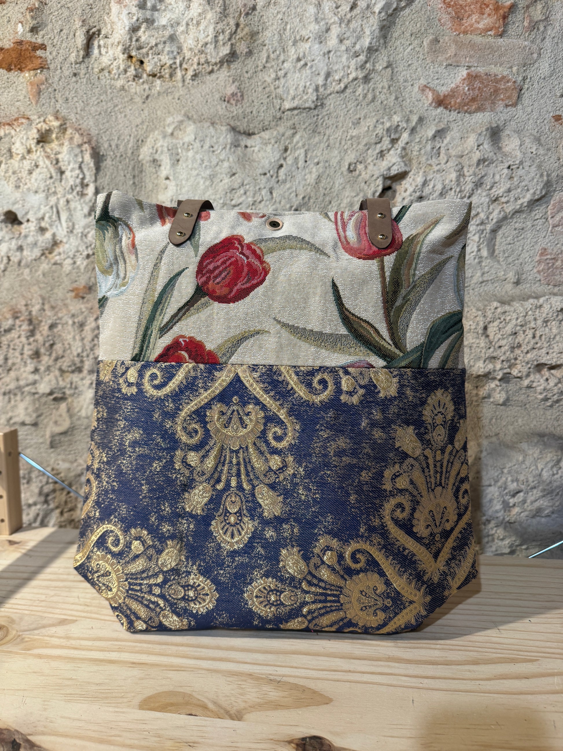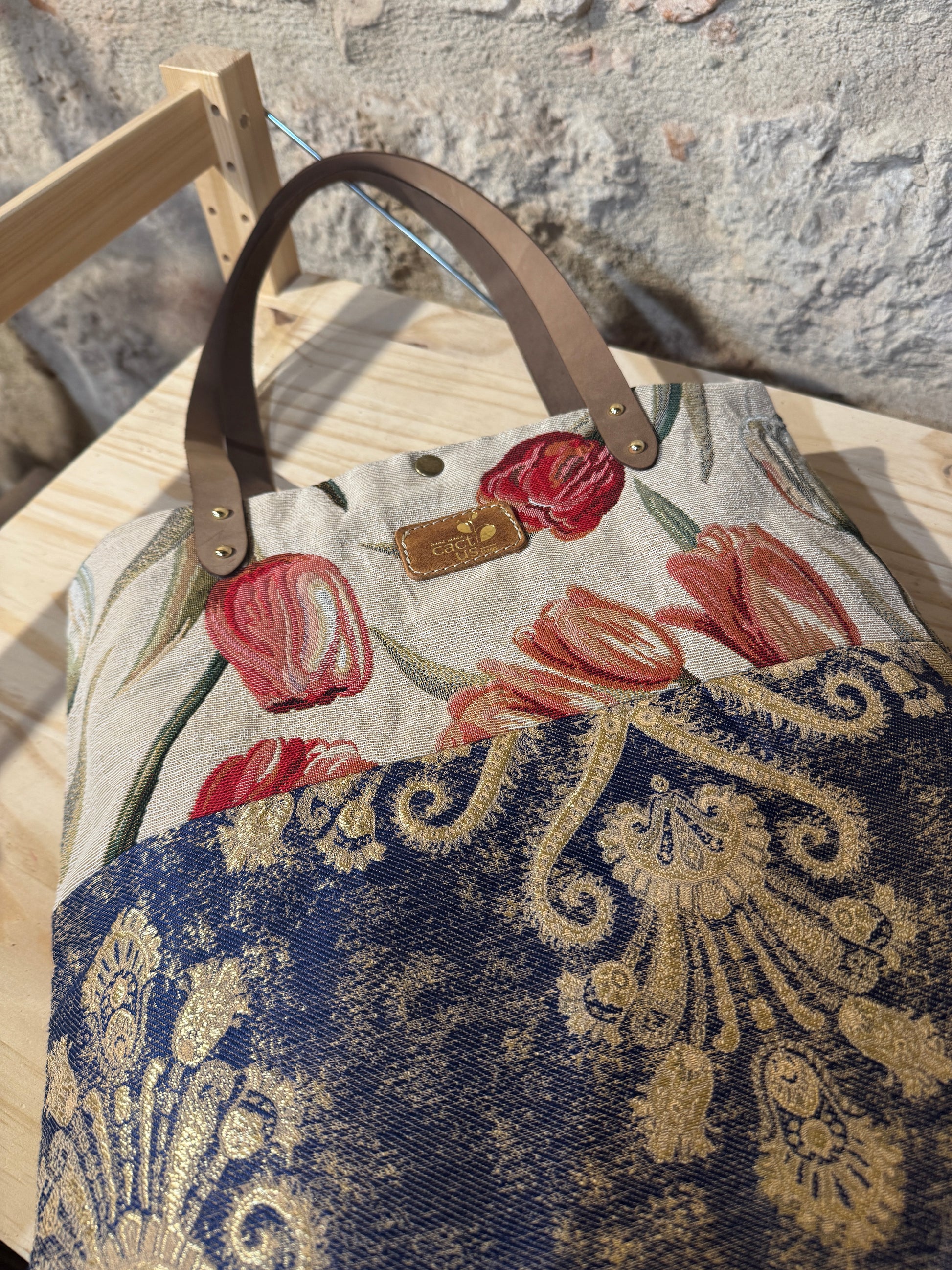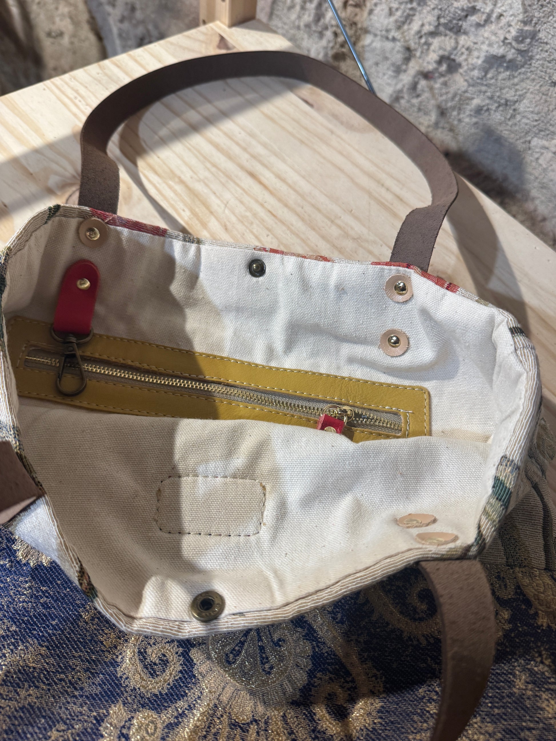 Realizzata in tessuto di tappezzeria con manici e laccetto tira zip in pelle.