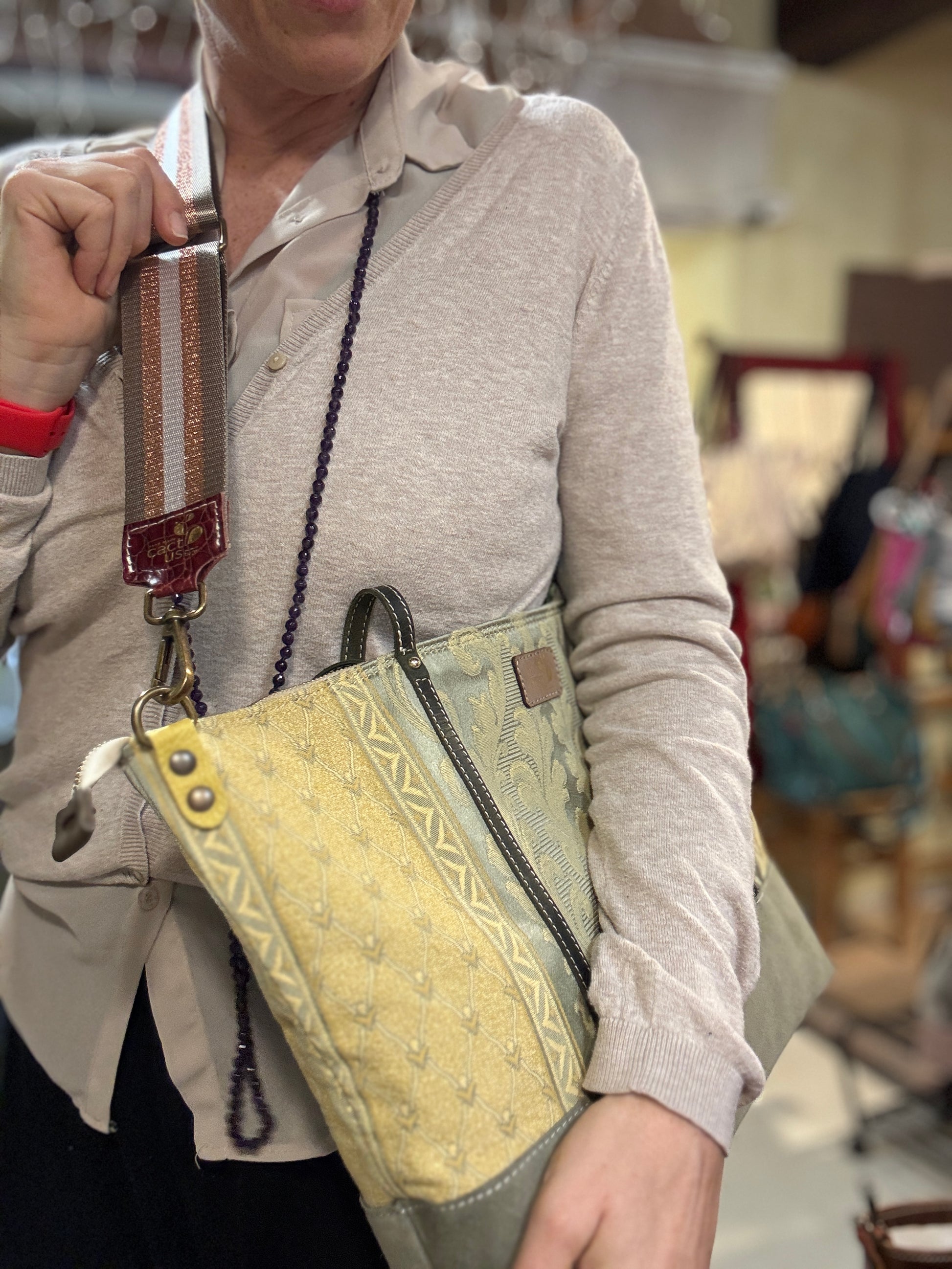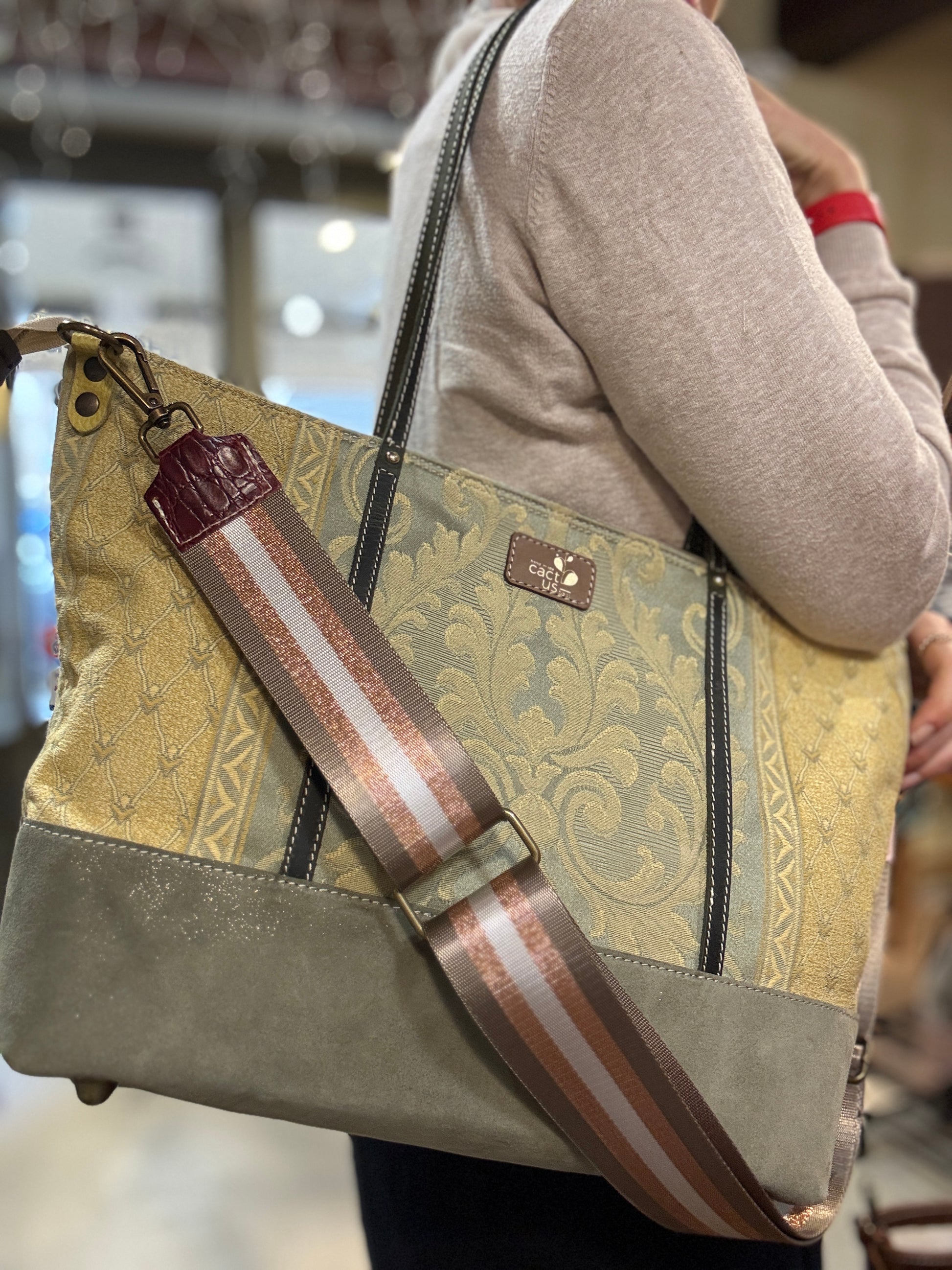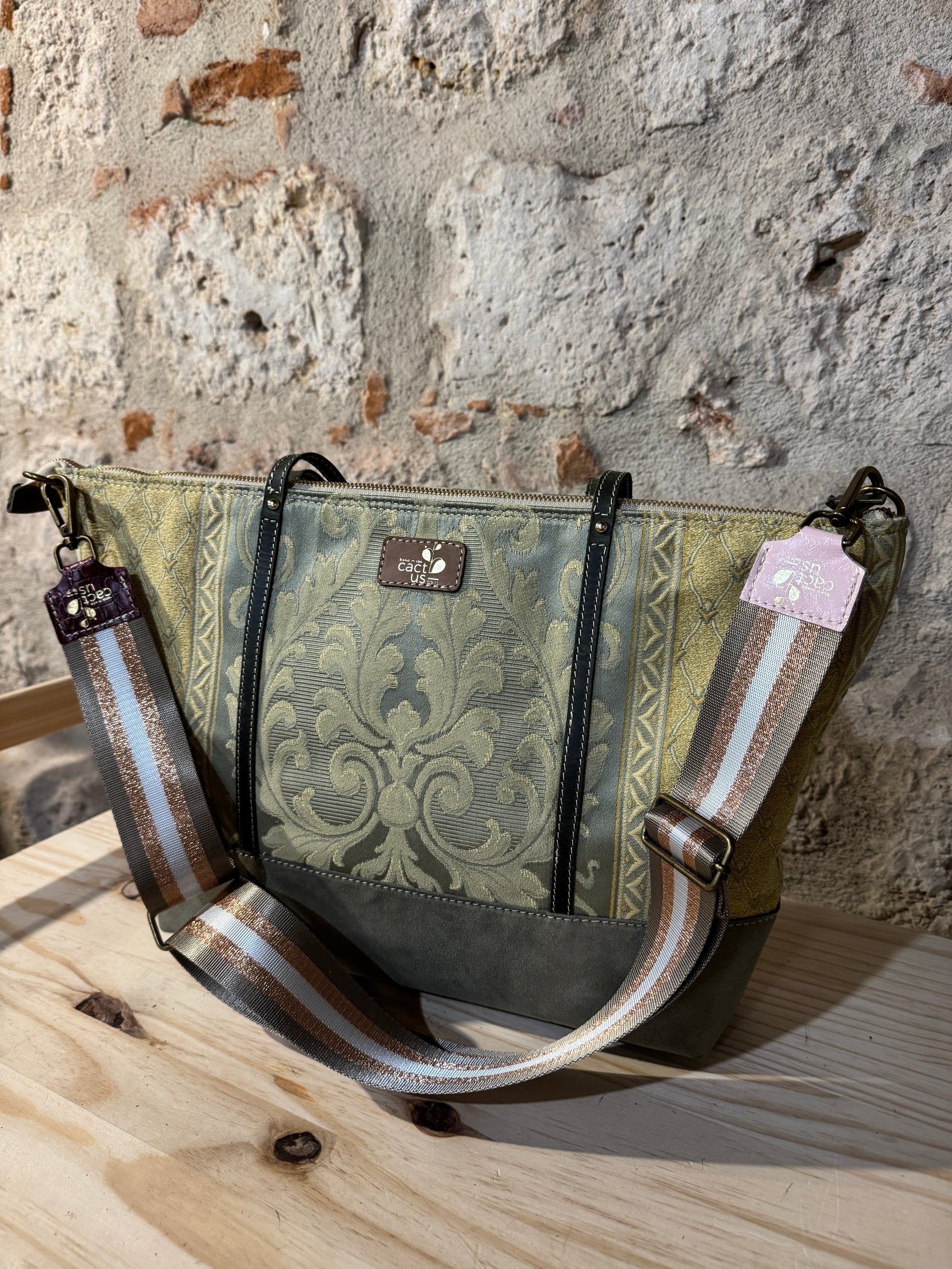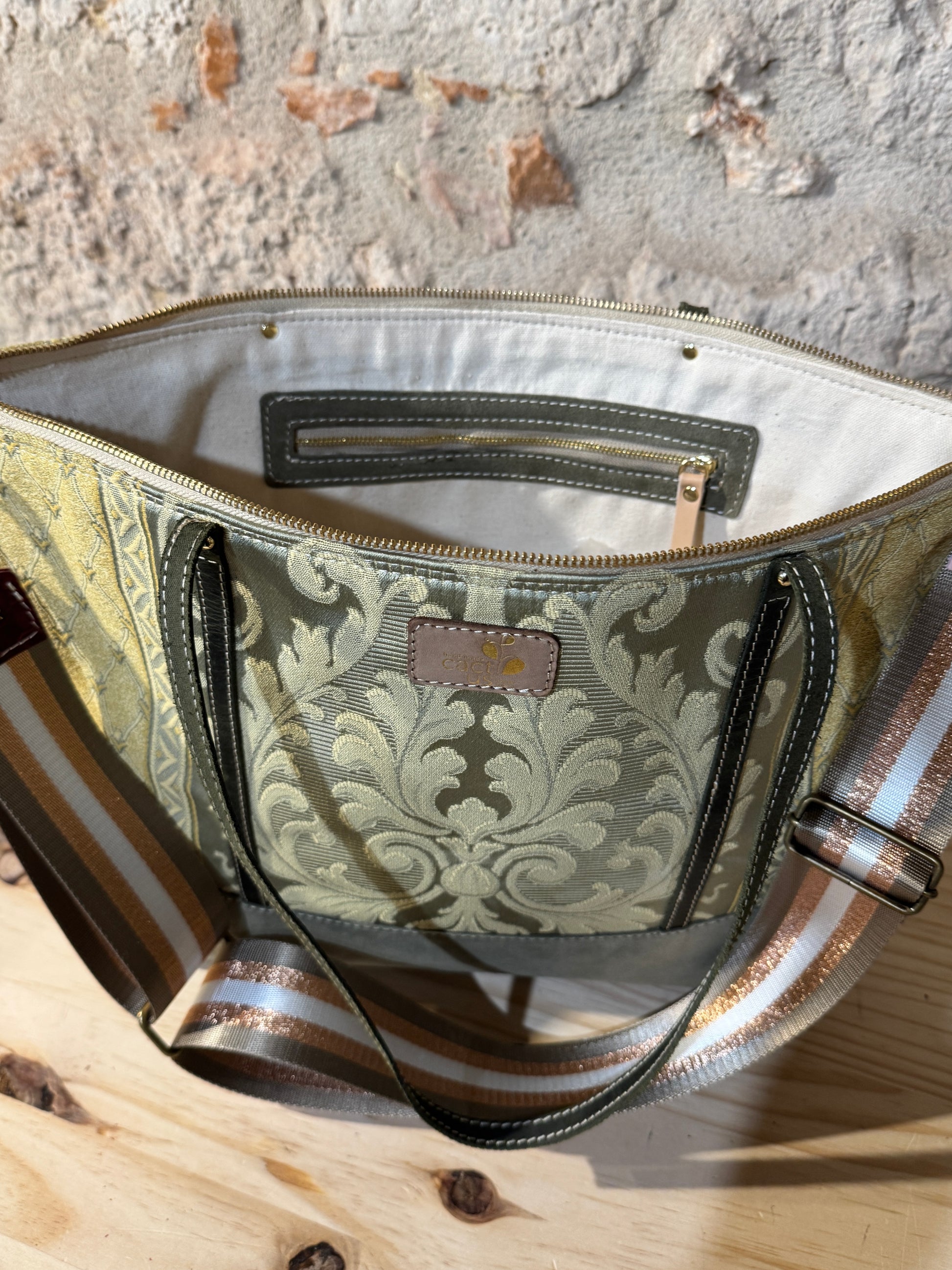 BORSA IN TESSUTO E MANICI E RIFINITURE IN PELLE