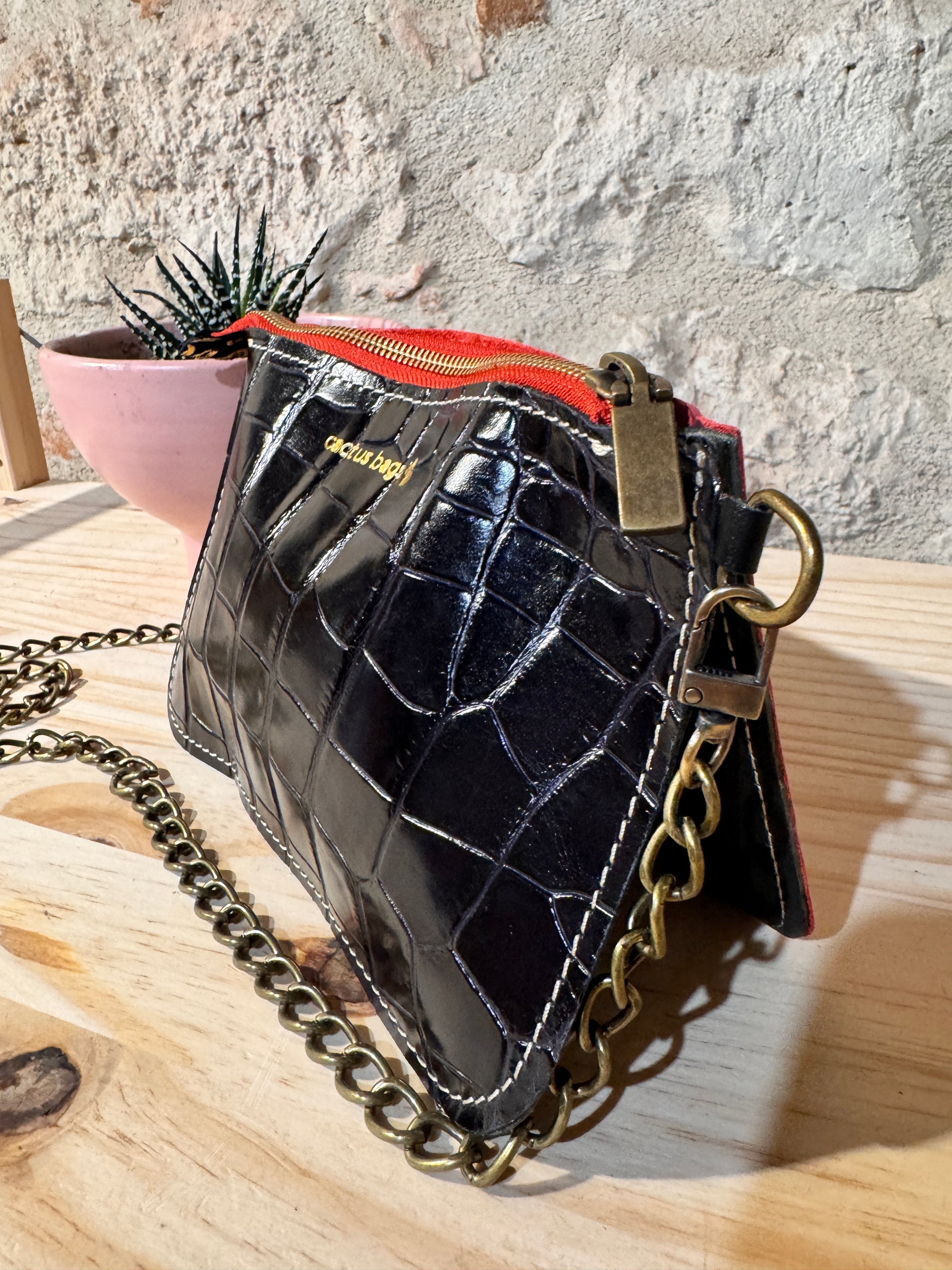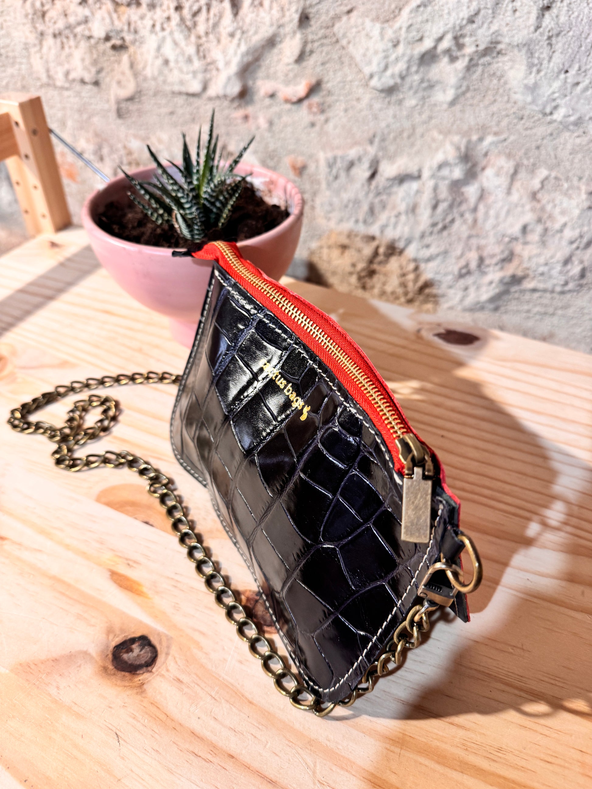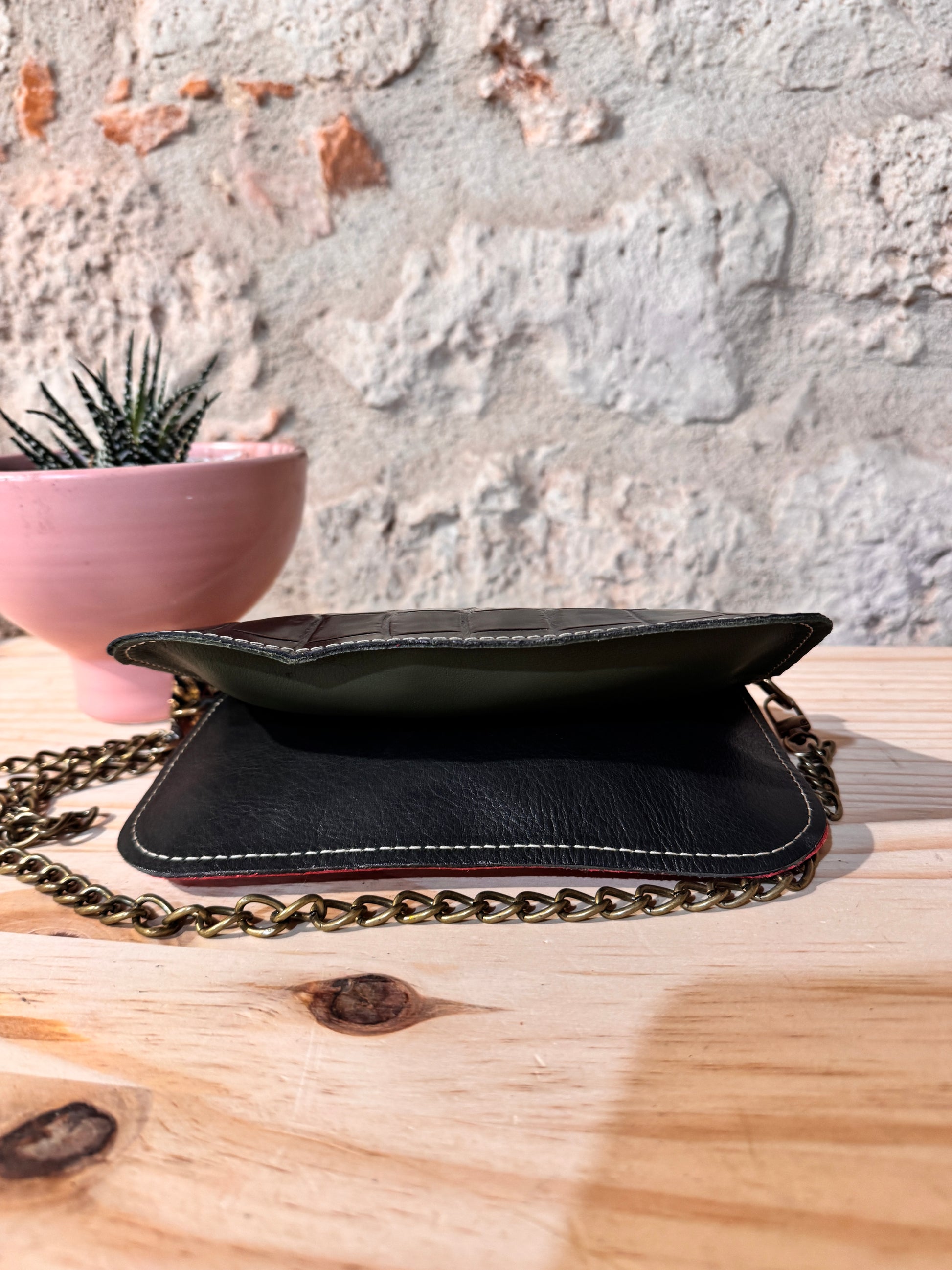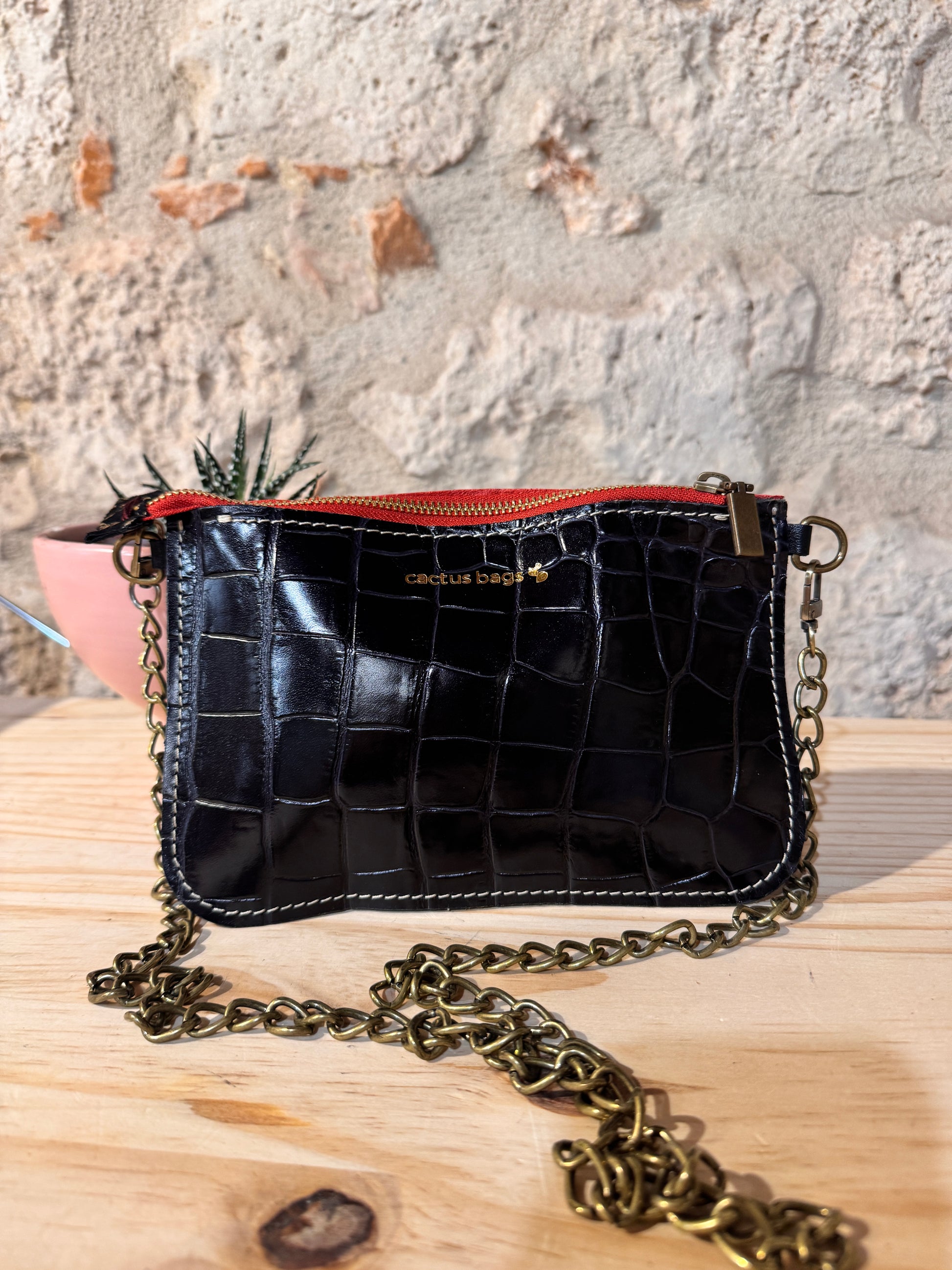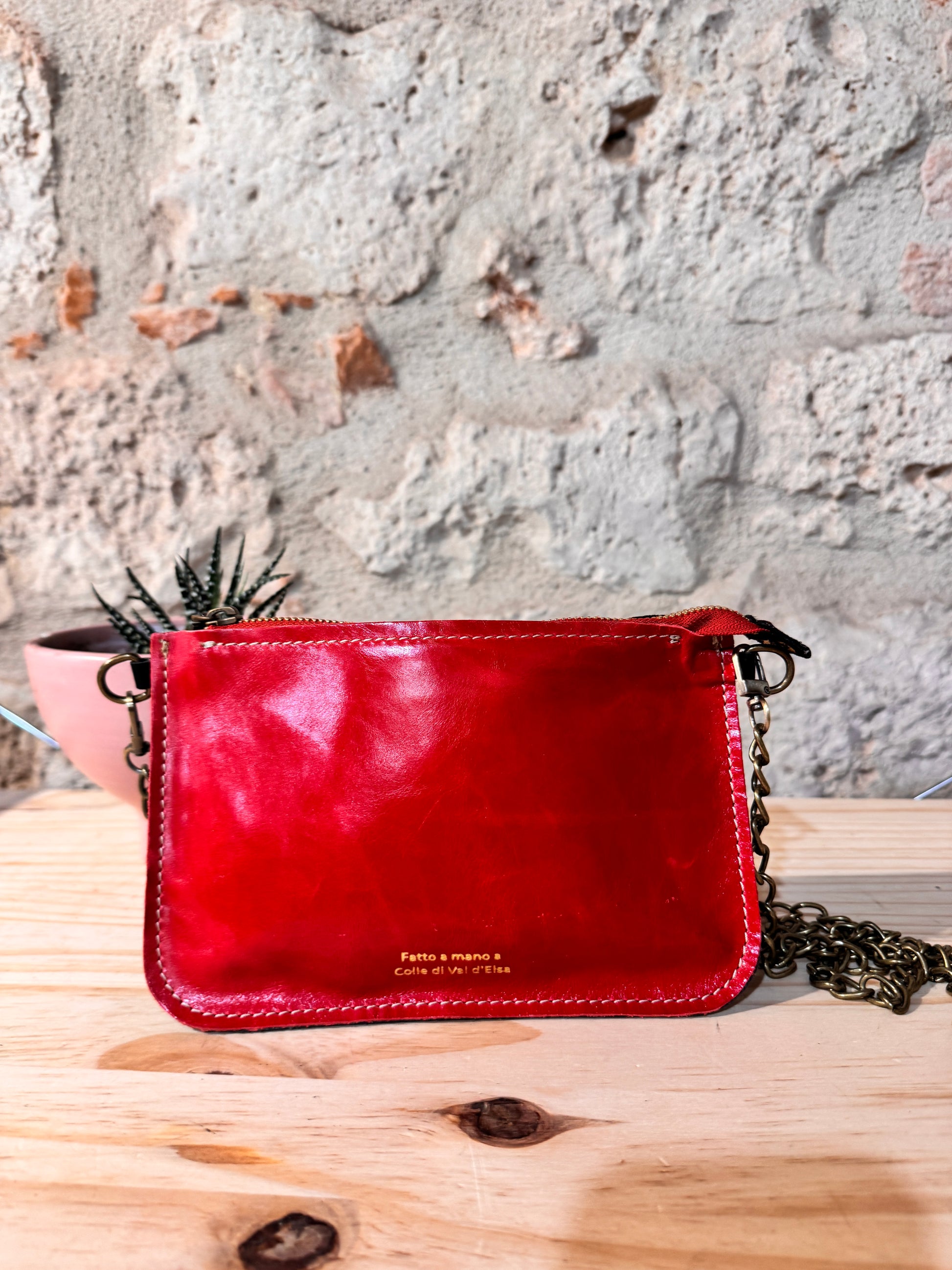 La pochette in pelle con tasca doppia, chiusa con cerniera, tracolla in metallo...