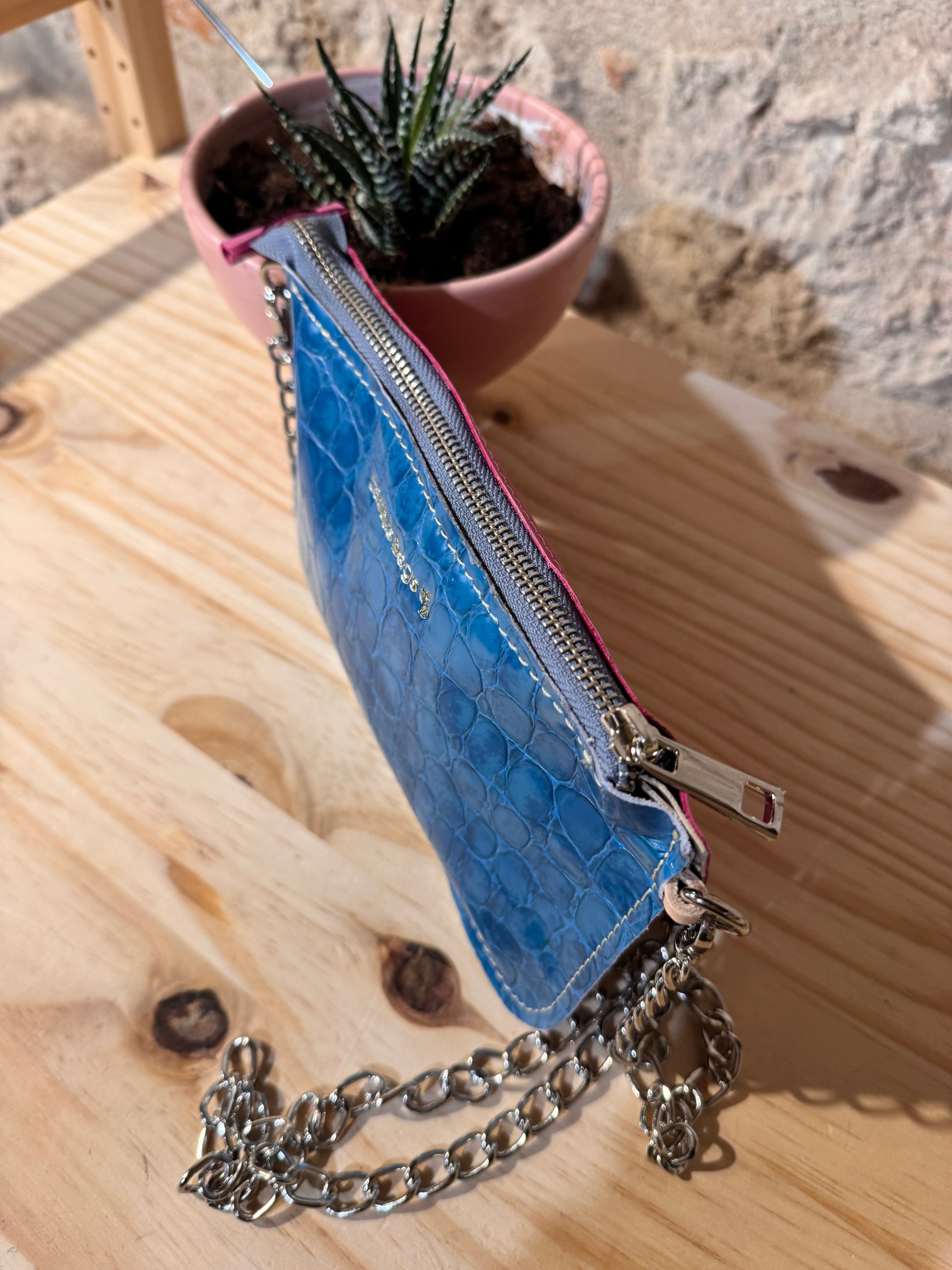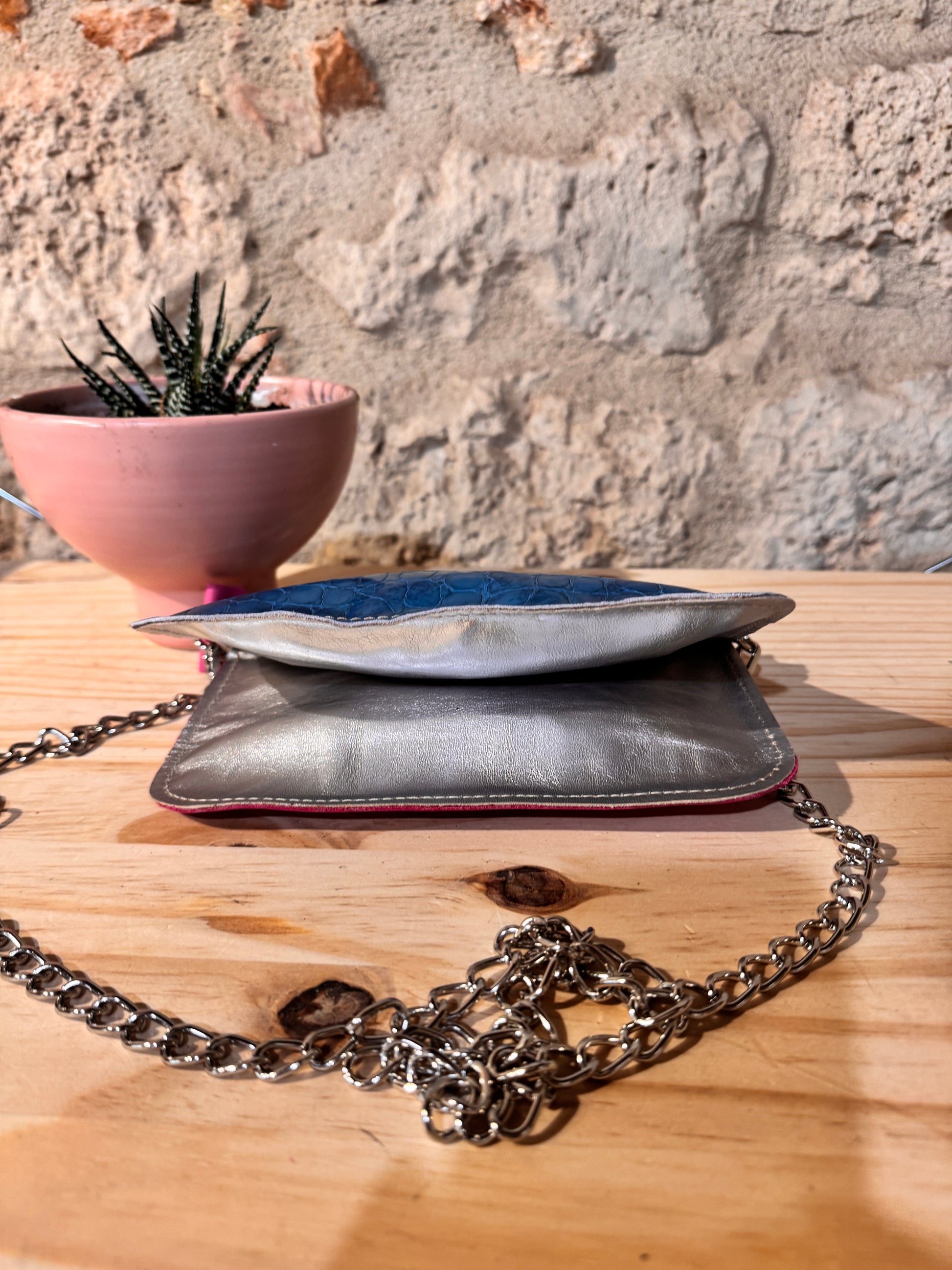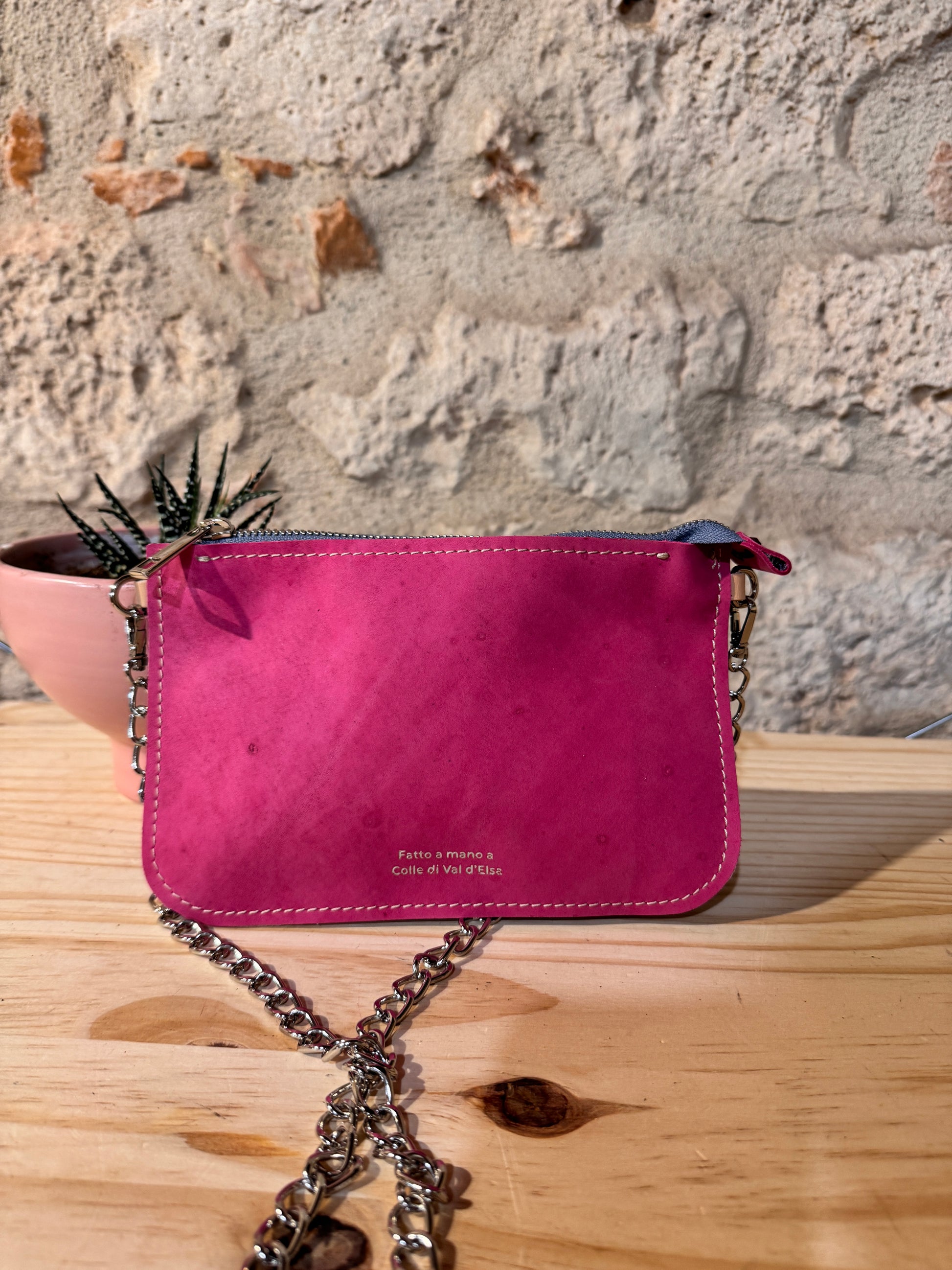 La pochette in pelle con tasca doppia, chiusa con cerniera, tracolla in metallo...