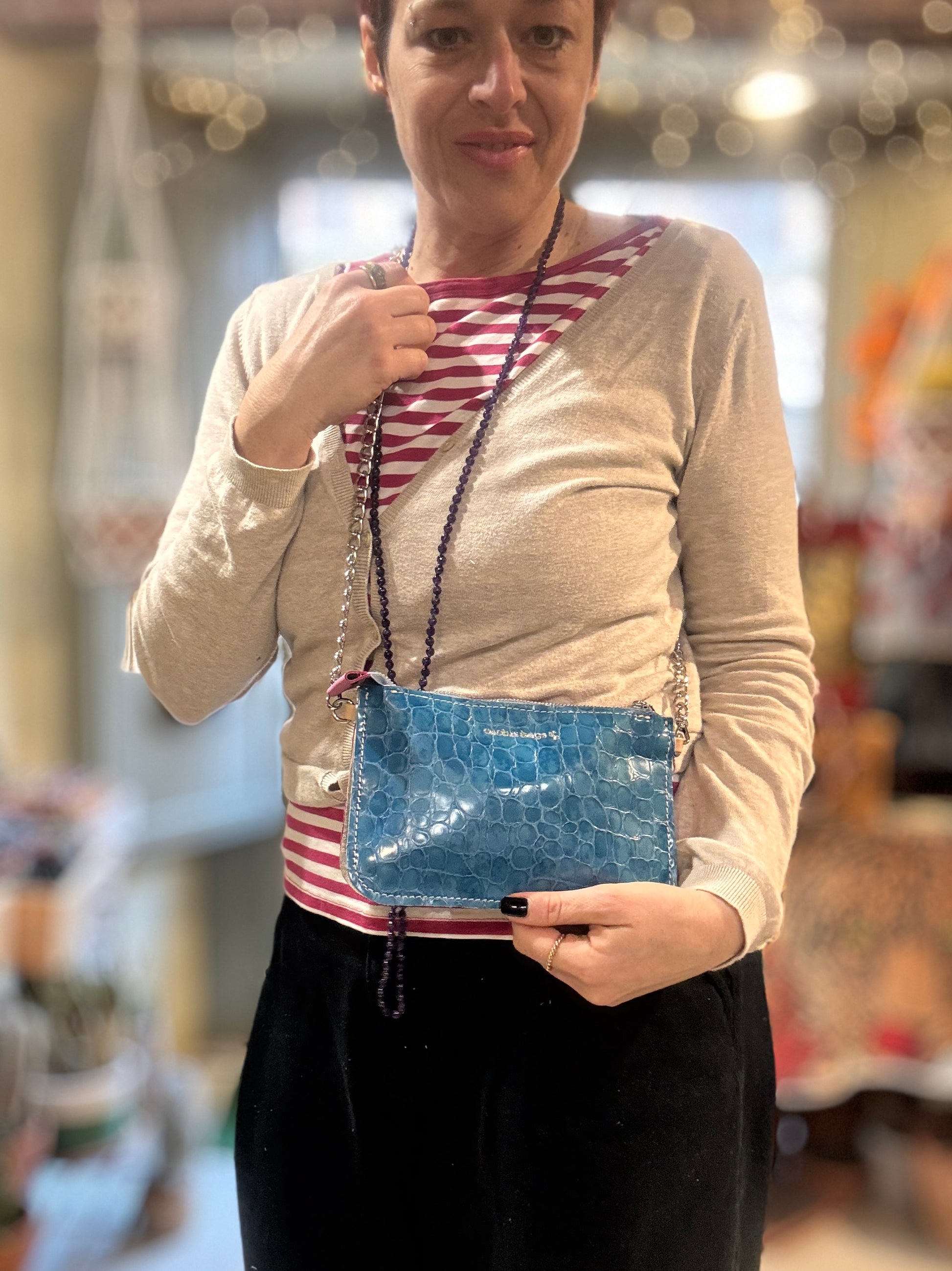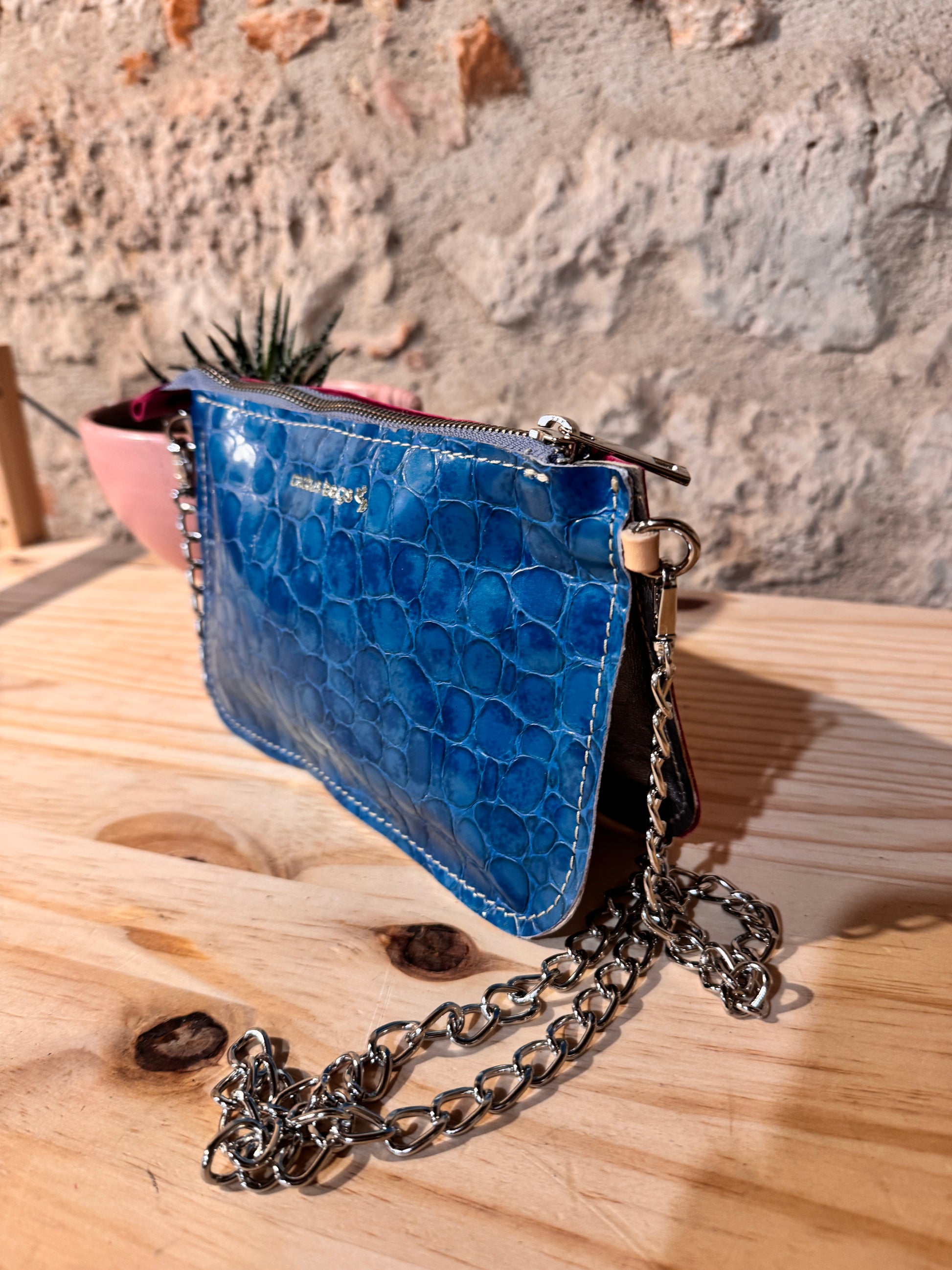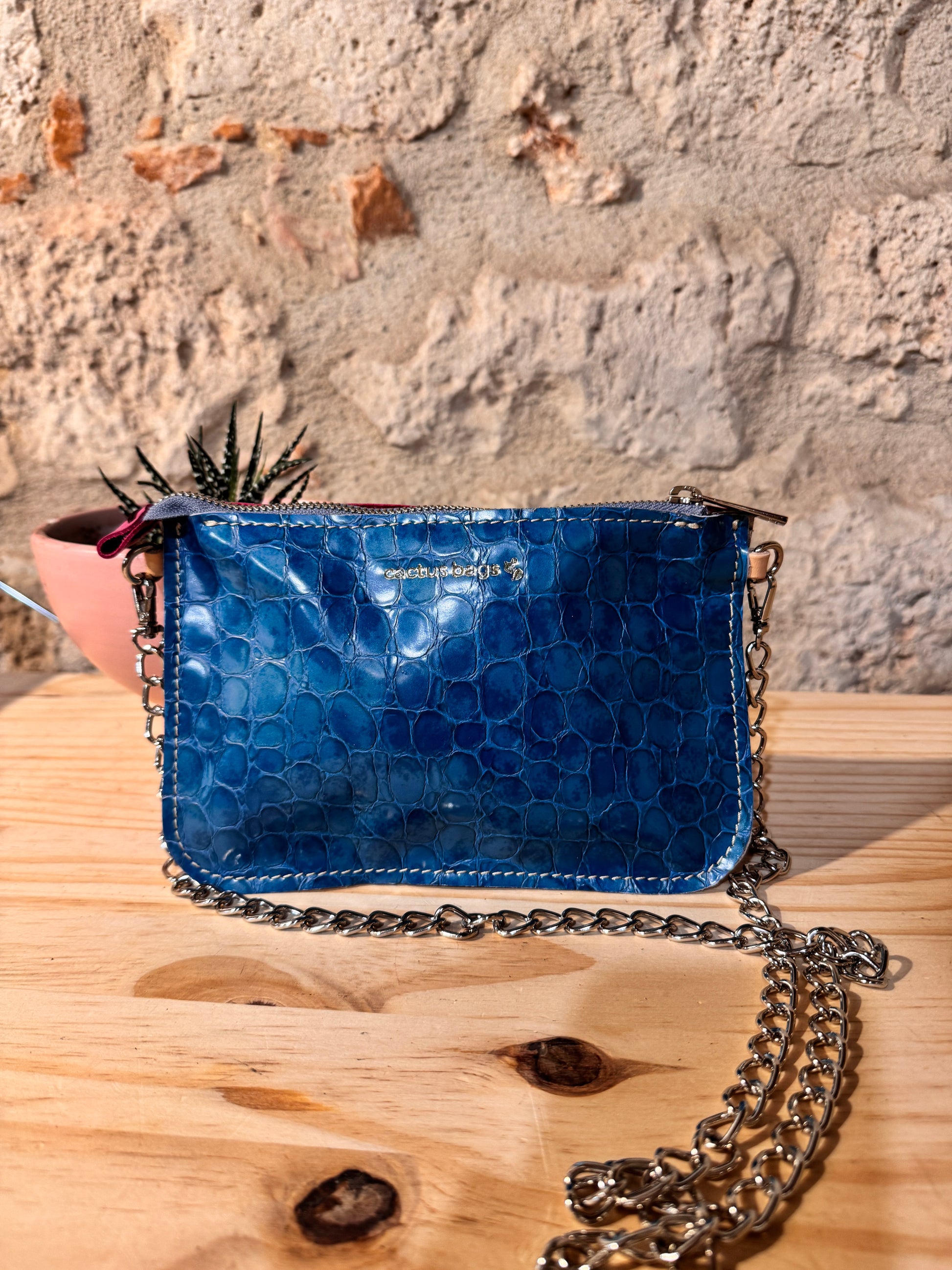 La pochette in pelle con tasca doppia, chiusa con cerniera, tracolla in metallo...